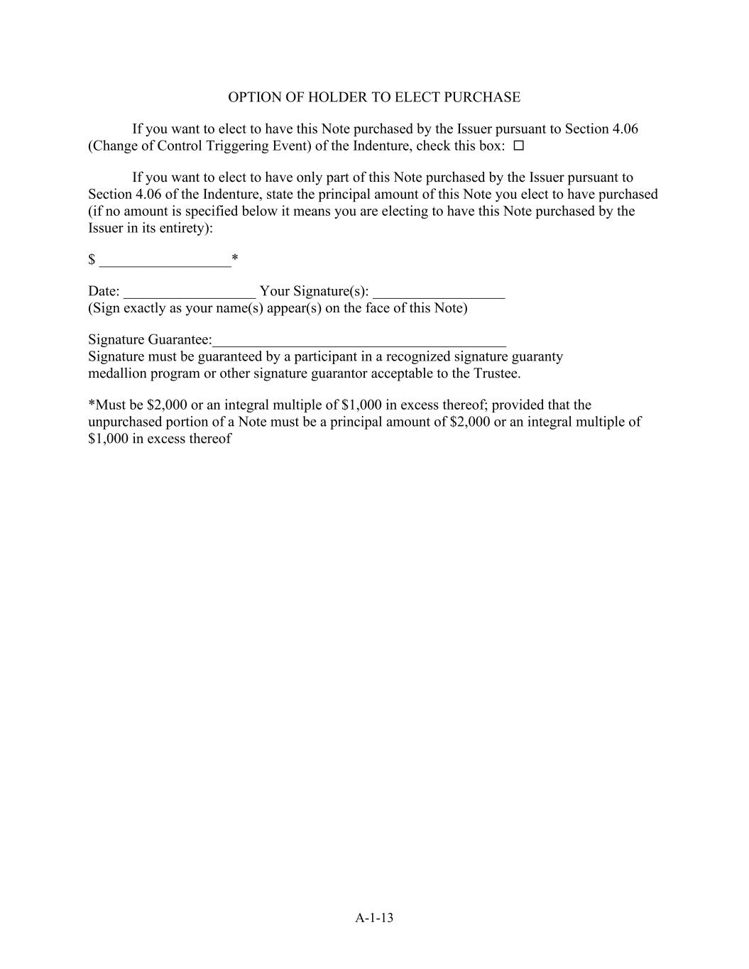 A-1-13 OPTION OF HOLDER TO ELECT PURCHASE If you want to elect to have this Note purchased by the Issuer pursuant to Section 4.06 (Change of Control Triggering Event) of the Indenture, check this box: If you want to elect to have only part of this Note purchased by the Issuer pursuant to Section 4.06 of the Indenture, state the principal amount of this Note you elect to have purchased (if no amount is specified below it means you are electing to have this Note purchased by the Issuer in its entirety): $ __________________* Date: __________________ Your Signature(s): __________________ (Sign exactly as your name(s) appear(s) on the face of this Note) Signature Guarantee:________________________________________ Signature must be guaranteed by a participant in a recognized signature guaranty medallion program or other signature guarantor acceptable to the Trustee. *Must be $2,000 or an integral multiple of $1,000 in excess thereof; provided that the unpurchased portion of a Note must be a principal amount of $2,000 or an integral multiple of $1,000 in excess thereof