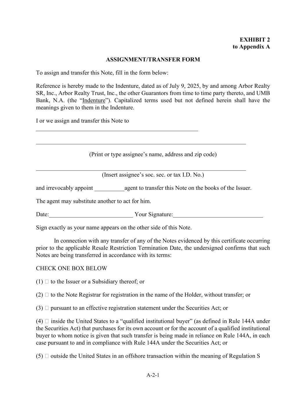 A-2-1 EXHIBIT 2 to Appendix A ASSIGNMENT/TRANSFER FORM To assign and transfer this Note, fill in the form below: Reference is hereby made to the Indenture, dated as of July 9, 2025, by and among Arbor Realty SR, Inc., Arbor Realty Trust, Inc., the other Guarantors from time to time party thereto, and UMB Bank, N.A. (the “Indenture”). Capitalized terms used but not defined herein shall have the meanings given to them in the Indenture. I or we assign and transfer this Note to ______________________________________________________ ______________________________________________________________________ (Print or type assignee’s name, address and zip code) ______________________________________________________________________ (Insert assignee’s soc. sec. or tax I.D. No.) and irrevocably appoint __________agent to transfer this Note on the books of the Issuer. The agent may substitute another to act for him. Date:____________________________ Your Signature:______________________________ Sign exactly as your name appears on the other side of this Note. In connection with any transfer of any of the Notes evidenced by this certificate occurring prior to the applicable Resale Restriction Termination Date, the undersigned confirms that such Notes are being transferred in accordance with its terms: CHECK ONE BOX BELOW (1) to the Issuer or a Subsidiary thereof; or (2) to the Note Registrar for registration in the name of the Holder, without transfer; or (3) pursuant to an effective registration statement under the Securities Act; or (4) inside the United States to a “qualified institutional buyer” (as defined in Rule 144A under the Securities Act) that purchases for its own account or for the account of a qualified institutional buyer to whom notice is given that such transfer is being made in reliance on Rule 144A, in each case pursuant to and in compliance with Rule 144A under the Securities Act; or (5) outside the United States in an offshore transaction within the meaning of Regulation S