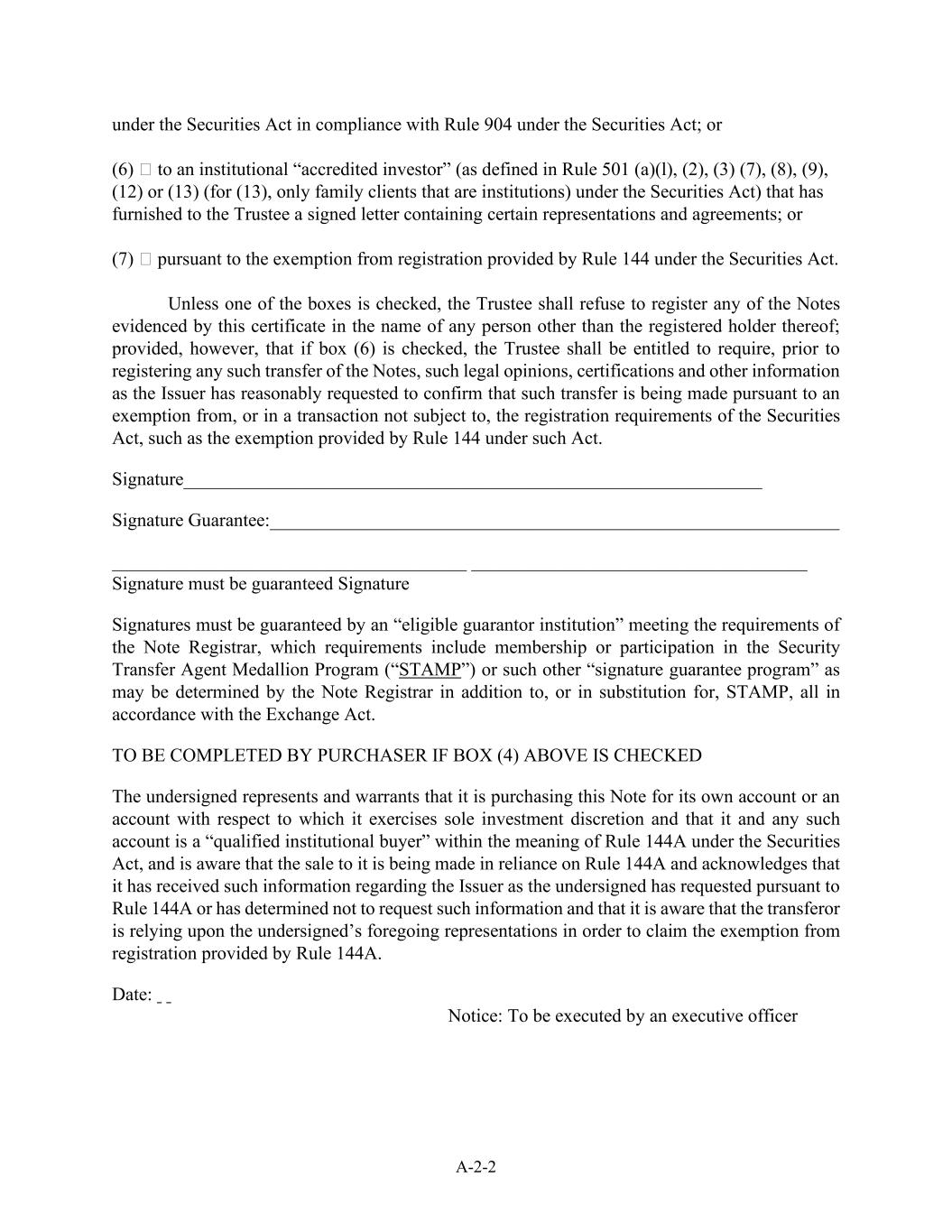 A-2-2 under the Securities Act in compliance with Rule 904 under the Securities Act; or (6) to an institutional “accredited investor” (as defined in Rule 501 (a)(l), (2), (3) (7), (8), (9), (12) or (13) (for (13), only family clients that are institutions) under the Securities Act) that has furnished to the Trustee a signed letter containing certain representations and agreements; or (7) pursuant to the exemption from registration provided by Rule 144 under the Securities Act. Unless one of the boxes is checked, the Trustee shall refuse to register any of the Notes evidenced by this certificate in the name of any person other than the registered holder thereof; provided, however, that if box (6) is checked, the Trustee shall be entitled to require, prior to registering any such transfer of the Notes, such legal opinions, certifications and other information as the Issuer has reasonably requested to confirm that such transfer is being made pursuant to an exemption from, or in a transaction not subject to, the registration requirements of the Securities Act, such as the exemption provided by Rule 144 under such Act. Signature______________________________________________________________ Signature Guarantee:_____________________________________________________________ ______________________________________ ____________________________________ Signature must be guaranteed Signature Signatures must be guaranteed by an “eligible guarantor institution” meeting the requirements of the Note Registrar, which requirements include membership or participation in the Security Transfer Agent Medallion Program (“STAMP”) or such other “signature guarantee program” as may be determined by the Note Registrar in addition to, or in substitution for, STAMP, all in accordance with the Exchange Act. TO BE COMPLETED BY PURCHASER IF BOX (4) ABOVE IS CHECKED The undersigned represents and warrants that it is purchasing this Note for its own account or an account with respect to which it exercises sole investment discretion and that it and any such account is a “qualified institutional buyer” within the meaning of Rule 144A under the Securities Act, and is aware that the sale to it is being made in reliance on Rule 144A and acknowledges that it has received such information regarding the Issuer as the undersigned has requested pursuant to Rule 144A or has determined not to request such information and that it is aware that the transferor is relying upon the undersigned’s foregoing representations in order to claim the exemption from registration provided by Rule 144A. Date: Notice: To be executed by an executive officer