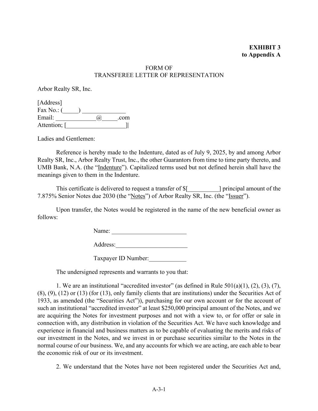 A-3-1 EXHIBIT 3 to Appendix A FORM OF TRANSFEREE LETTER OF REPRESENTATION Arbor Realty SR, Inc. [Address] Fax No.: (_____) ______________ Email: _____________@_____.com Attention; [___________________]| Ladies and Gentlemen: Reference is hereby made to the Indenture, dated as of July 9, 2025, by and among Arbor Realty SR, Inc., Arbor Realty Trust, Inc., the other Guarantors from time to time party thereto, and UMB Bank, N.A. (the “Indenture”). Capitalized terms used but not defined herein shall have the meanings given to them in the Indenture. This certificate is delivered to request a transfer of $[__________] principal amount of the 7.875% Senior Notes due 2030 (the “Notes”) of Arbor Realty SR, Inc. (the “Issuer”). Upon transfer, the Notes would be registered in the name of the new beneficial owner as follows: Name: ________________________ Address:_______________________ Taxpayer ID Number:____________ The undersigned represents and warrants to you that: 1. We are an institutional “accredited investor” (as defined in Rule 501(a)(1), (2), (3), (7), (8), (9), (12) or (13) (for (13), only family clients that are institutions) under the Securities Act of 1933, as amended (the “Securities Act”)), purchasing for our own account or for the account of such an institutional “accredited investor” at least $250,000 principal amount of the Notes, and we are acquiring the Notes for investment purposes and not with a view to, or for offer or sale in connection with, any distribution in violation of the Securities Act. We have such knowledge and experience in financial and business matters as to be capable of evaluating the merits and risks of our investment in the Notes, and we invest in or purchase securities similar to the Notes in the normal course of our business. We, and any accounts for which we are acting, are each able to bear the economic risk of our or its investment. 2. We understand that the Notes have not been registered under the Securities Act and,