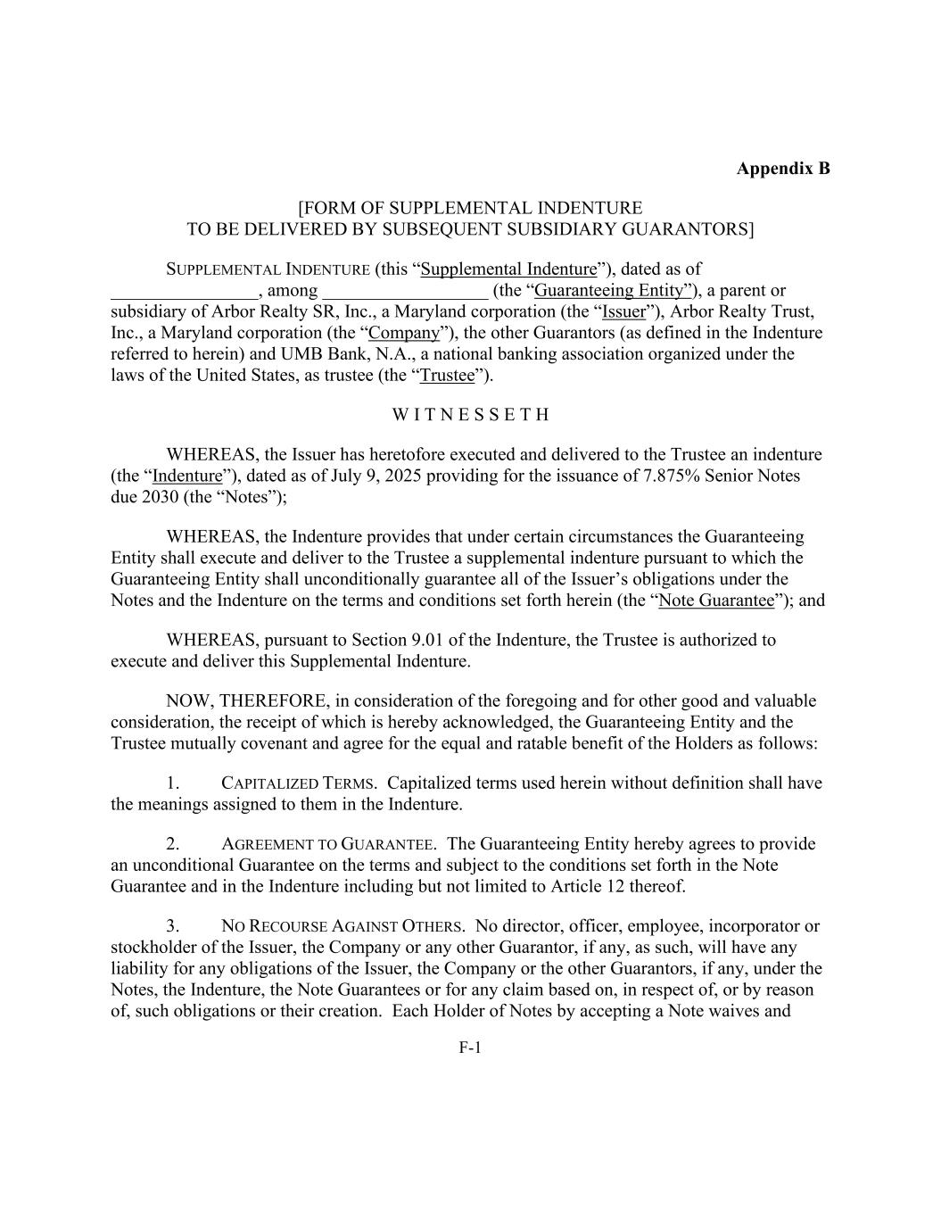 F-1 Appendix B [FORM OF SUPPLEMENTAL INDENTURE TO BE DELIVERED BY SUBSEQUENT SUBSIDIARY GUARANTORS] SUPPLEMENTAL INDENTURE (this “Supplemental Indenture”), dated as of ________________, among __________________ (the “Guaranteeing Entity”), a parent or subsidiary of Arbor Realty SR, Inc., a Maryland corporation (the “Issuer”), Arbor Realty Trust, Inc., a Maryland corporation (the “Company”), the other Guarantors (as defined in the Indenture referred to herein) and UMB Bank, N.A., a national banking association organized under the laws of the United States, as trustee (the “Trustee”). W I T N E S S E T H WHEREAS, the Issuer has heretofore executed and delivered to the Trustee an indenture (the “Indenture”), dated as of July 9, 2025 providing for the issuance of 7.875% Senior Notes due 2030 (the “Notes”); WHEREAS, the Indenture provides that under certain circumstances the Guaranteeing Entity shall execute and deliver to the Trustee a supplemental indenture pursuant to which the Guaranteeing Entity shall unconditionally guarantee all of the Issuer’s obligations under the Notes and the Indenture on the terms and conditions set forth herein (the “Note Guarantee”); and WHEREAS, pursuant to Section 9.01 of the Indenture, the Trustee is authorized to execute and deliver this Supplemental Indenture. NOW, THEREFORE, in consideration of the foregoing and for other good and valuable consideration, the receipt of which is hereby acknowledged, the Guaranteeing Entity and the Trustee mutually covenant and agree for the equal and ratable benefit of the Holders as follows: 1. CAPITALIZED TERMS. Capitalized terms used herein without definition shall have the meanings assigned to them in the Indenture. 2. AGREEMENT TO GUARANTEE. The Guaranteeing Entity hereby agrees to provide an unconditional Guarantee on the terms and subject to the conditions set forth in the Note Guarantee and in the Indenture including but not limited to Article 12 thereof. 3. NO RECOURSE AGAINST OTHERS. No director, officer, employee, incorporator or stockholder of the Issuer, the Company or any other Guarantor, if any, as such, will have any liability for any obligations of the Issuer, the Company or the other Guarantors, if any, under the Notes, the Indenture, the Note Guarantees or for any claim based on, in respect of, or by reason of, such obligations or their creation. Each Holder of Notes by accepting a Note waives and