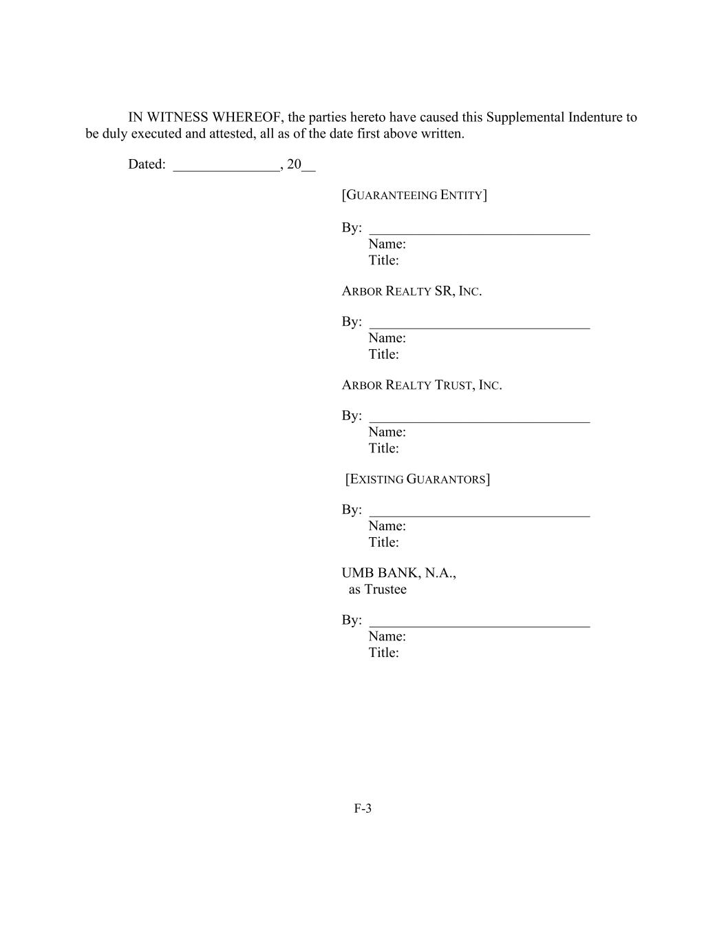 F-3 IN WITNESS WHEREOF, the parties hereto have caused this Supplemental Indenture to be duly executed and attested, all as of the date first above written. Dated: _______________, 20__ [GUARANTEEING ENTITY] By: _______________________________ Name: Title: ARBOR REALTY SR, INC. By: _______________________________ Name: Title: ARBOR REALTY TRUST, INC. By: _______________________________ Name: Title: [EXISTING GUARANTORS] By: _______________________________ Name: Title: UMB BANK, N.A., as Trustee By: _______________________________ Name: Title: