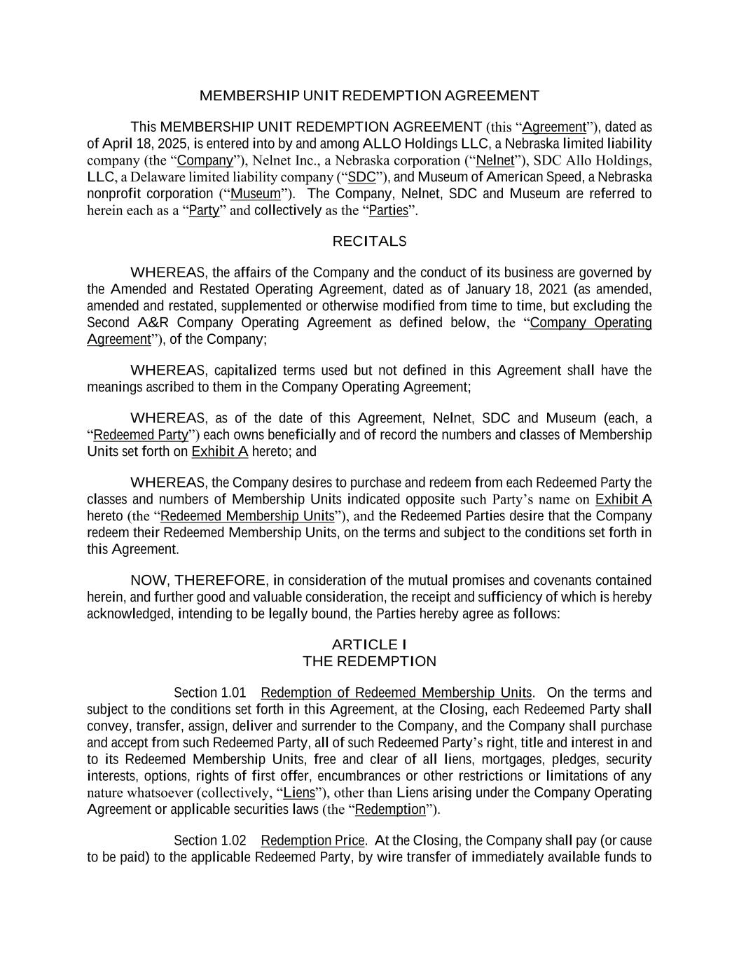 MEMBERSHIP UNIT REDEMPTION AGREEMENT This MEMBERSHIP UNIT REDEMPTION AGREEMENT (this “Agreement”), dated as of April 18, 2025, is entered into by and among ALLO Holdings LLC, a Nebraska limited liability company (the “Company”), Nelnet Inc., a Nebraska corporation (“Nelnet”), SDC Allo Holdings, LLC, a Delaware limited liability company (“SDC”), and Museum of American Speed, a Nebraska nonprofit corporation (“Museum”). The Company, Nelnet, SDC and Museum are referred to herein each as a “Party” and collectively as the “Parties”. RECITALS WHEREAS, the affairs of the Company and the conduct of its business are governed by the Amended and Restated Operating Agreement, dated as of January 18, 2021 (as amended, amended and restated, supplemented or otherwise modified from time to time, but excluding the Second A&R Company Operating Agreement as defined below, the “Company Operating Agreement”), of the Company; WHEREAS, capitalized terms used but not defined in this Agreement shall have the meanings ascribed to them in the Company Operating Agreement; WHEREAS, as of the date of this Agreement, Nelnet, SDC and Museum (each, a “Redeemed Party”) each owns beneficially and of record the numbers and classes of Membership Units set forth on Exhibit A hereto; and WHEREAS, the Company desires to purchase and redeem from each Redeemed Party the classes and numbers of Membership Units indicated opposite such Party’s name on Exhibit A hereto (the “Redeemed Membership Units”), and the Redeemed Parties desire that the Company redeem their Redeemed Membership Units, on the terms and subject to the conditions set forth in this Agreement. NOW, THEREFORE, in consideration of the mutual promises and covenants contained herein, and further good and valuable consideration, the receipt and sufficiency of which is hereby acknowledged, intending to be legally bound, the Parties hereby agree as follows: ARTICLE I THE REDEMPTION Section 1.01 Redemption of Redeemed Membership Units. On the terms and subject to the conditions set forth in this Agreement, at the Closing, each Redeemed Party shall convey, transfer, assign, deliver and surrender to the Company, and the Company shall purchase and accept from such Redeemed Party, all of such Redeemed Party’s right, title and interest in and to its Redeemed Membership Units, free and clear of all liens, mortgages, pledges, security interests, options, rights of first offer, encumbrances or other restrictions or limitations of any nature whatsoever (collectively, “Liens”), other than Liens arising under the Company Operating Agreement or applicable securities laws (the “Redemption”). Section 1.02 Redemption Price. At the Closing, the Company shall pay (or cause to be paid) to the applicable Redeemed Party, by wire transfer of immediately available funds to
