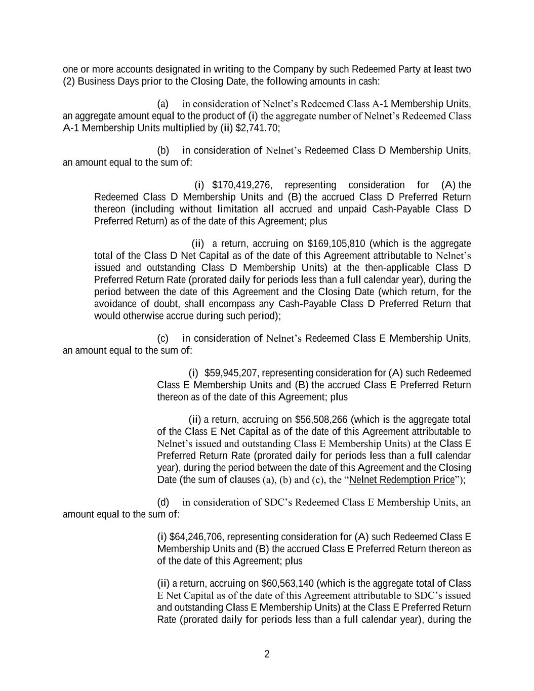 2 one or more accounts designated in writing to the Company by such Redeemed Party at least two (2) Business Days prior to the Closing Date, the following amounts in cash: (a) in consideration of Nelnet’s Redeemed Class A-1 Membership Units, an aggregate amount equal to the product of (i) the aggregate number of Nelnet’s Redeemed Class A-1 Membership Units multiplied by (ii) $2,741.70; (b) in consideration of Nelnet’s Redeemed Class D Membership Units, an amount equal to the sum of: (i) $170,419,276, representing consideration for (A) the Redeemed Class D Membership Units and (B) the accrued Class D Preferred Return thereon (including without limitation all accrued and unpaid Cash-Payable Class D Preferred Return) as of the date of this Agreement; plus (ii) a return, accruing on $169,105,810 (which is the aggregate total of the Class D Net Capital as of the date of this Agreement attributable to Nelnet’s issued and outstanding Class D Membership Units) at the then-applicable Class D Preferred Return Rate (prorated daily for periods less than a full calendar year), during the period between the date of this Agreement and the Closing Date (which return, for the avoidance of doubt, shall encompass any Cash-Payable Class D Preferred Return that would otherwise accrue during such period); (c) in consideration of Nelnet’s Redeemed Class E Membership Units, an amount equal to the sum of: (i) $59,945,207, representing consideration for (A) such Redeemed Class E Membership Units and (B) the accrued Class E Preferred Return thereon as of the date of this Agreement; plus (ii) a return, accruing on $56,508,266 (which is the aggregate total of the Class E Net Capital as of the date of this Agreement attributable to Nelnet’s issued and outstanding Class E Membership Units) at the Class E Preferred Return Rate (prorated daily for periods less than a full calendar year), during the period between the date of this Agreement and the Closing Date (the sum of clauses (a), (b) and (c), the “Nelnet Redemption Price”); (d) in consideration of SDC’s Redeemed Class E Membership Units, an amount equal to the sum of: (i) $64,246,706, representing consideration for (A) such Redeemed Class E Membership Units and (B) the accrued Class E Preferred Return thereon as of the date of this Agreement; plus (ii) a return, accruing on $60,563,140 (which is the aggregate total of Class E Net Capital as of the date of this Agreement attributable to SDC’s issued and outstanding Class E Membership Units) at the Class E Preferred Return Rate (prorated daily for periods less than a full calendar year), during the