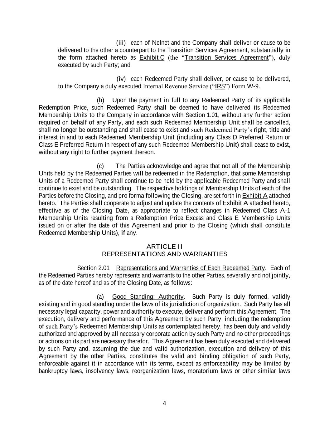 4 (iii) each of Nelnet and the Company shall deliver or cause to be delivered to the other a counterpart to the Transition Services Agreement, substantially in the form attached hereto as Exhibit C (the “Transition Services Agreement”), duly executed by such Party; and (iv) each Redeemed Party shall deliver, or cause to be delivered, to the Company a duly executed Internal Revenue Service (“IRS”) Form W-9. (b) Upon the payment in full to any Redeemed Party of its applicable Redemption Price, such Redeemed Party shall be deemed to have delivered its Redeemed Membership Units to the Company in accordance with Section 1.01, without any further action required on behalf of any Party, and each such Redeemed Membership Unit shall be cancelled, shall no longer be outstanding and shall cease to exist and such Redeemed Party’s right, title and interest in and to each Redeemed Membership Unit (including any Class D Preferred Return or Class E Preferred Return in respect of any such Redeemed Membership Unit) shall cease to exist, without any right to further payment thereon. (c) The Parties acknowledge and agree that not all of the Membership Units held by the Redeemed Parties will be redeemed in the Redemption, that some Membership Units of a Redeemed Party shall continue to be held by the applicable Redeemed Party and shall continue to exist and be outstanding. The respective holdings of Membership Units of each of the Parties before the Closing, and pro forma following the Closing, are set forth in Exhibit A attached hereto. The Parties shall cooperate to adjust and update the contents of Exhibit A attached hereto, effective as of the Closing Date, as appropriate to reflect changes in Redeemed Class A-1 Membership Units resulting from a Redemption Price Excess and Class E Membership Units issued on or after the date of this Agreement and prior to the Closing (which shall constitute Redeemed Membership Units), if any. ARTICLE II REPRESENTATIONS AND WARRANTIES Section 2.01 Representations and Warranties of Each Redeemed Party. Each of the Redeemed Parties hereby represents and warrants to the other Parties, severally and not jointly, as of the date hereof and as of the Closing Date, as follows: (a) Good Standing; Authority. Such Party is duly formed, validly existing and in good standing under the laws of its jurisdiction of organization. Such Party has all necessary legal capacity, power and authority to execute, deliver and perform this Agreement. The execution, delivery and performance of this Agreement by such Party, including the redemption of such Party’s Redeemed Membership Units as contemplated hereby, has been duly and validly authorized and approved by all necessary corporate action by such Party and no other proceedings or actions on its part are necessary therefor. This Agreement has been duly executed and delivered by such Party and, assuming the due and valid authorization, execution and delivery of this Agreement by the other Parties, constitutes the valid and binding obligation of such Party, enforceable against it in accordance with its terms, except as enforceability may be limited by bankruptcy laws, insolvency laws, reorganization laws, moratorium laws or other similar laws
