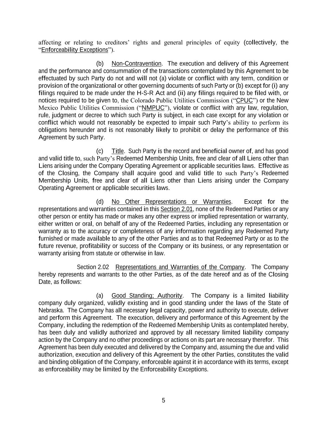 5 affecting or relating to creditors’ rights and general principles of equity (collectively, the “Enforceability Exceptions”). (b) Non-Contravention. The execution and delivery of this Agreement and the performance and consummation of the transactions contemplated by this Agreement to be effectuated by such Party do not and will not (a) violate or conflict with any term, condition or provision of the organizational or other governing documents of such Party or (b) except for (i) any filings required to be made under the H-S-R Act and (ii) any filings required to be filed with, or notices required to be given to, the Colorado Public Utilities Commission (“CPUC”) or the New Mexico Public Utilities Commission (“NMPUC”), violate or conflict with any law, regulation, rule, judgment or decree to which such Party is subject, in each case except for any violation or conflict which would not reasonably be expected to impair such Party’s ability to perform its obligations hereunder and is not reasonably likely to prohibit or delay the performance of this Agreement by such Party. (c) Title. Such Party is the record and beneficial owner of, and has good and valid title to, such Party’s Redeemed Membership Units, free and clear of all Liens other than Liens arising under the Company Operating Agreement or applicable securities laws. Effective as of the Closing, the Company shall acquire good and valid title to such Party’s Redeemed Membership Units, free and clear of all Liens other than Liens arising under the Company Operating Agreement or applicable securities laws. (d) No Other Representations or Warranties. Except for the representations and warranties contained in this Section 2.01, none of the Redeemed Parties or any other person or entity has made or makes any other express or implied representation or warranty, either written or oral, on behalf of any of the Redeemed Parties, including any representation or warranty as to the accuracy or completeness of any information regarding any Redeemed Party furnished or made available to any of the other Parties and as to that Redeemed Party or as to the future revenue, profitability or success of the Company or its business, or any representation or warranty arising from statute or otherwise in law. Section 2.02 Representations and Warranties of the Company. The Company hereby represents and warrants to the other Parties, as of the date hereof and as of the Closing Date, as follows: (a) Good Standing; Authority. The Company is a limited liability company duly organized, validly existing and in good standing under the laws of the State of Nebraska. The Company has all necessary legal capacity, power and authority to execute, deliver and perform this Agreement. The execution, delivery and performance of this Agreement by the Company, including the redemption of the Redeemed Membership Units as contemplated hereby, has been duly and validly authorized and approved by all necessary limited liability company action by the Company and no other proceedings or actions on its part are necessary therefor. This Agreement has been duly executed and delivered by the Company and, assuming the due and valid authorization, execution and delivery of this Agreement by the other Parties, constitutes the valid and binding obligation of the Company, enforceable against it in accordance with its terms, except as enforceability may be limited by the Enforceability Exceptions.