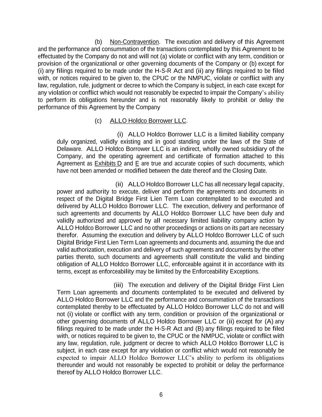 6 (b) Non-Contravention. The execution and delivery of this Agreement and the performance and consummation of the transactions contemplated by this Agreement to be effectuated by the Company do not and will not (a) violate or conflict with any term, condition or provision of the organizational or other governing documents of the Company or (b) except for (i) any filings required to be made under the H-S-R Act and (ii) any filings required to be filed with, or notices required to be given to, the CPUC or the NMPUC, violate or conflict with any law, regulation, rule, judgment or decree to which the Company is subject, in each case except for any violation or conflict which would not reasonably be expected to impair the Company’s ability to perform its obligations hereunder and is not reasonably likely to prohibit or delay the performance of this Agreement by the Company (c) ALLO Holdco Borrower LLC. (i) ALLO Holdco Borrower LLC is a limited liability company duly organized, validly existing and in good standing under the laws of the State of Delaware. ALLO Holdco Borrower LLC is an indirect, wholly owned subsidiary of the Company, and the operating agreement and certificate of formation attached to this Agreement as Exhibits D and E are true and accurate copies of such documents, which have not been amended or modified between the date thereof and the Closing Date. (ii) ALLO Holdco Borrower LLC has all necessary legal capacity, power and authority to execute, deliver and perform the agreements and documents in respect of the Digital Bridge First Lien Term Loan contemplated to be executed and delivered by ALLO Holdco Borrower LLC. The execution, delivery and performance of such agreements and documents by ALLO Holdco Borrower LLC have been duly and validly authorized and approved by all necessary limited liability company action by ALLO Holdco Borrower LLC and no other proceedings or actions on its part are necessary therefor. Assuming the execution and delivery by ALLO Holdco Borrower LLC of such Digital Bridge First Lien Term Loan agreements and documents and, assuming the due and valid authorization, execution and delivery of such agreements and documents by the other parties thereto, such documents and agreements shall constitute the valid and binding obligation of ALLO Holdco Borrower LLC, enforceable against it in accordance with its terms, except as enforceability may be limited by the Enforceability Exceptions. (iii) The execution and delivery of the Digital Bridge First Lien Term Loan agreements and documents contemplated to be executed and delivered by ALLO Holdco Borrower LLC and the performance and consummation of the transactions contemplated thereby to be effectuated by ALLO Holdco Borrower LLC do not and will not (i) violate or conflict with any term, condition or provision of the organizational or other governing documents of ALLO Holdco Borrower LLC or (ii) except for (A) any filings required to be made under the H-S-R Act and (B) any filings required to be filed with, or notices required to be given to, the CPUC or the NMPUC, violate or conflict with any law, regulation, rule, judgment or decree to which ALLO Holdco Borrower LLC is subject, in each case except for any violation or conflict which would not reasonably be expected to impair ALLO Holdco Borrower LLC’s ability to perform its obligations thereunder and would not reasonably be expected to prohibit or delay the performance thereof by ALLO Holdco Borrower LLC.