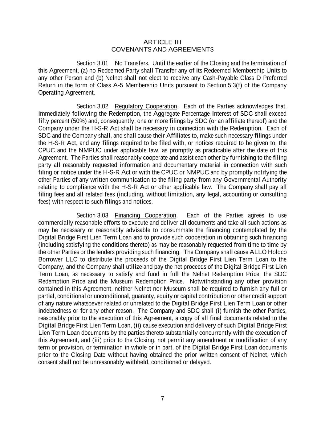 7 ARTICLE III COVENANTS AND AGREEMENTS Section 3.01 No Transfers. Until the earlier of the Closing and the termination of this Agreement, (a) no Redeemed Party shall Transfer any of its Redeemed Membership Units to any other Person and (b) Nelnet shall not elect to receive any Cash-Payable Class D Preferred Return in the form of Class A-5 Membership Units pursuant to Section 5.3(f) of the Company Operating Agreement. Section 3.02 Regulatory Cooperation. Each of the Parties acknowledges that, immediately following the Redemption, the Aggregate Percentage Interest of SDC shall exceed fifty percent (50%) and, consequently, one or more filings by SDC (or an affiliate thereof) and the Company under the H-S-R Act shall be necessary in connection with the Redemption. Each of SDC and the Company shall, and shall cause their Affiliates to, make such necessary filings under the H-S-R Act, and any filings required to be filed with, or notices required to be given to, the CPUC and the NMPUC under applicable law, as promptly as practicable after the date of this Agreement. The Parties shall reasonably cooperate and assist each other by furnishing to the filing party all reasonably requested information and documentary material in connection with such filing or notice under the H-S-R Act or with the CPUC or NMPUC and by promptly notifying the other Parties of any written communication to the filing party from any Governmental Authority relating to compliance with the H-S-R Act or other applicable law. The Company shall pay all filing fees and all related fees (including, without limitation, any legal, accounting or consulting fees) with respect to such filings and notices. Section 3.03 Financing Cooperation. Each of the Parties agrees to use commercially reasonable efforts to execute and deliver all documents and take all such actions as may be necessary or reasonably advisable to consummate the financing contemplated by the Digital Bridge First Lien Term Loan and to provide such cooperation in obtaining such financing (including satisfying the conditions thereto) as may be reasonably requested from time to time by the other Parties or the lenders providing such financing. The Company shall cause ALLO Holdco Borrower LLC to distribute the proceeds of the Digital Bridge First Lien Term Loan to the Company, and the Company shall utilize and pay the net proceeds of the Digital Bridge First Lien Term Loan, as necessary to satisfy and fund in full the Nelnet Redemption Price, the SDC Redemption Price and the Museum Redemption Price. Notwithstanding any other provision contained in this Agreement, neither Nelnet nor Museum shall be required to furnish any full or partial, conditional or unconditional, guaranty, equity or capital contribution or other credit support of any nature whatsoever related or unrelated to the Digital Bridge First Lien Term Loan or other indebtedness or for any other reason. The Company and SDC shall (i) furnish the other Parties, reasonably prior to the execution of this Agreement, a copy of all final documents related to the Digital Bridge First Lien Term Loan, (ii) cause execution and delivery of such Digital Bridge First Lien Term Loan documents by the parties thereto substantially concurrently with the execution of this Agreement, and (iii) prior to the Closing, not permit any amendment or modification of any term or provision, or termination in whole or in part, of the Digital Bridge First Loan documents prior to the Closing Date without having obtained the prior written consent of Nelnet, which consent shall not be unreasonably withheld, conditioned or delayed.