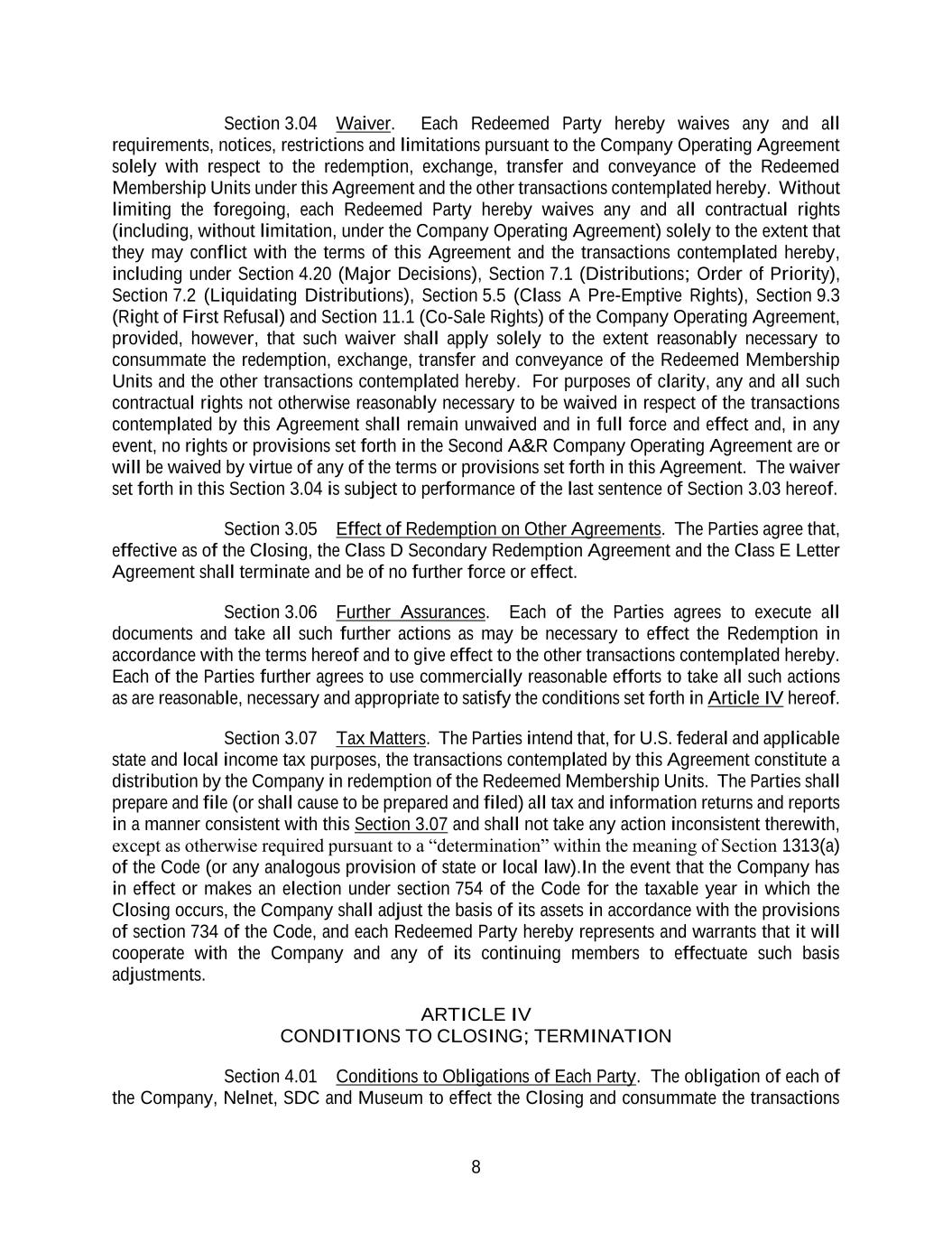 8 Section 3.04 Waiver. Each Redeemed Party hereby waives any and all requirements, notices, restrictions and limitations pursuant to the Company Operating Agreement solely with respect to the redemption, exchange, transfer and conveyance of the Redeemed Membership Units under this Agreement and the other transactions contemplated hereby. Without limiting the foregoing, each Redeemed Party hereby waives any and all contractual rights (including, without limitation, under the Company Operating Agreement) solely to the extent that they may conflict with the terms of this Agreement and the transactions contemplated hereby, including under Section 4.20 (Major Decisions), Section 7.1 (Distributions; Order of Priority), Section 7.2 (Liquidating Distributions), Section 5.5 (Class A Pre-Emptive Rights), Section 9.3 (Right of First Refusal) and Section 11.1 (Co-Sale Rights) of the Company Operating Agreement, provided, however, that such waiver shall apply solely to the extent reasonably necessary to consummate the redemption, exchange, transfer and conveyance of the Redeemed Membership Units and the other transactions contemplated hereby. For purposes of clarity, any and all such contractual rights not otherwise reasonably necessary to be waived in respect of the transactions contemplated by this Agreement shall remain unwaived and in full force and effect and, in any event, no rights or provisions set forth in the Second A&R Company Operating Agreement are or will be waived by virtue of any of the terms or provisions set forth in this Agreement. The waiver set forth in this Section 3.04 is subject to performance of the last sentence of Section 3.03 hereof. Section 3.05 Effect of Redemption on Other Agreements. The Parties agree that, effective as of the Closing, the Class D Secondary Redemption Agreement and the Class E Letter Agreement shall terminate and be of no further force or effect. Section 3.06 Further Assurances. Each of the Parties agrees to execute all documents and take all such further actions as may be necessary to effect the Redemption in accordance with the terms hereof and to give effect to the other transactions contemplated hereby. Each of the Parties further agrees to use commercially reasonable efforts to take all such actions as are reasonable, necessary and appropriate to satisfy the conditions set forth in Article IV hereof. Section 3.07 Tax Matters. The Parties intend that, for U.S. federal and applicable state and local income tax purposes, the transactions contemplated by this Agreement constitute a distribution by the Company in redemption of the Redeemed Membership Units. The Parties shall prepare and file (or shall cause to be prepared and filed) all tax and information returns and reports in a manner consistent with this Section 3.07 and shall not take any action inconsistent therewith, except as otherwise required pursuant to a “determination” within the meaning of Section 1313(a) of the Code (or any analogous provision of state or local law).In the event that the Company has in effect or makes an election under section 754 of the Code for the taxable year in which the Closing occurs, the Company shall adjust the basis of its assets in accordance with the provisions of section 734 of the Code, and each Redeemed Party hereby represents and warrants that it will cooperate with the Company and any of its continuing members to effectuate such basis adjustments. ARTICLE IV CONDITIONS TO CLOSING; TERMINATION Section 4.01 Conditions to Obligations of Each Party. The obligation of each of the Company, Nelnet, SDC and Museum to effect the Closing and consummate the transactions