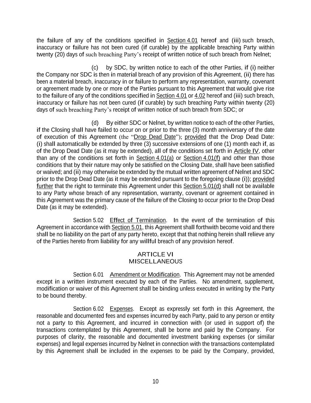 10 the failure of any of the conditions specified in Section 4.01 hereof and (iii) such breach, inaccuracy or failure has not been cured (if curable) by the applicable breaching Party within twenty (20) days of such breaching Party’s receipt of written notice of such breach from Nelnet; (c) by SDC, by written notice to each of the other Parties, if (i) neither the Company nor SDC is then in material breach of any provision of this Agreement, (ii) there has been a material breach, inaccuracy in or failure to perform any representation, warranty, covenant or agreement made by one or more of the Parties pursuant to this Agreement that would give rise to the failure of any of the conditions specified in Section 4.01 or 4.02 hereof and (iii) such breach, inaccuracy or failure has not been cured (if curable) by such breaching Party within twenty (20) days of such breaching Party’s receipt of written notice of such breach from SDC; or (d) By either SDC or Nelnet, by written notice to each of the other Parties, if the Closing shall have failed to occur on or prior to the three (3) month anniversary of the date of execution of this Agreement (the “Drop Dead Date”); provided that the Drop Dead Date: (i) shall automatically be extended by three (3) successive extensions of one (1) month each if, as of the Drop Dead Date (as it may be extended), all of the conditions set forth in Article IV, other than any of the conditions set forth in Section 4.01(a) or Section 4.01(f) and other than those conditions that by their nature may only be satisfied on the Closing Date, shall have been satisfied or waived; and (ii) may otherwise be extended by the mutual written agreement of Nelnet and SDC prior to the Drop Dead Date (as it may be extended pursuant to the foregoing clause (i)); provided further that the right to terminate this Agreement under this Section 5.01(d) shall not be available to any Party whose breach of any representation, warranty, covenant or agreement contained in this Agreement was the primary cause of the failure of the Closing to occur prior to the Drop Dead Date (as it may be extended). Section 5.02 Effect of Termination. In the event of the termination of this Agreement in accordance with Section 5.01, this Agreement shall forthwith become void and there shall be no liability on the part of any party hereto, except that that nothing herein shall relieve any of the Parties hereto from liability for any willful breach of any provision hereof. ARTICLE VI MISCELLANEOUS Section 6.01 Amendment or Modification. This Agreement may not be amended except in a written instrument executed by each of the Parties. No amendment, supplement, modification or waiver of this Agreement shall be binding unless executed in writing by the Party to be bound thereby. Section 6.02 Expenses. Except as expressly set forth in this Agreement, the reasonable and documented fees and expenses incurred by each Party, paid to any person or entity not a party to this Agreement, and incurred in connection with (or used in support of) the transactions contemplated by this Agreement, shall be borne and paid by the Company. For purposes of clarity, the reasonable and documented investment banking expenses (or similar expenses) and legal expenses incurred by Nelnet in connection with the transactions contemplated by this Agreement shall be included in the expenses to be paid by the Company, provided,