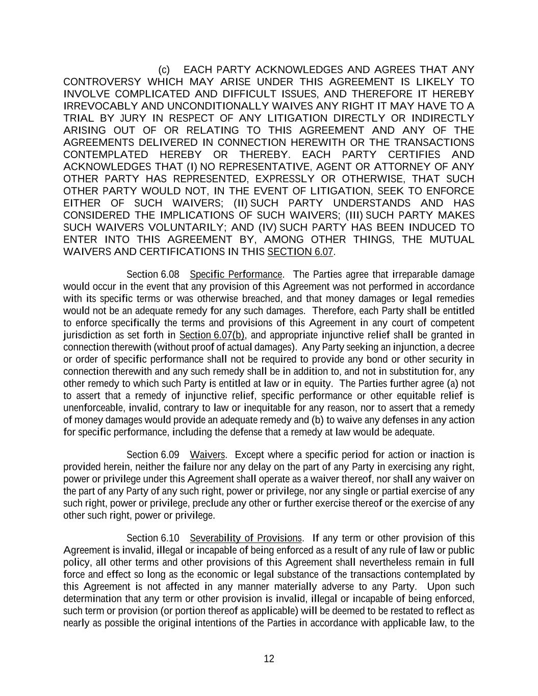 12 (c) EACH PARTY ACKNOWLEDGES AND AGREES THAT ANY CONTROVERSY WHICH MAY ARISE UNDER THIS AGREEMENT IS LIKELY TO INVOLVE COMPLICATED AND DIFFICULT ISSUES, AND THEREFORE IT HEREBY IRREVOCABLY AND UNCONDITIONALLY WAIVES ANY RIGHT IT MAY HAVE TO A TRIAL BY JURY IN RESPECT OF ANY LITIGATION DIRECTLY OR INDIRECTLY ARISING OUT OF OR RELATING TO THIS AGREEMENT AND ANY OF THE AGREEMENTS DELIVERED IN CONNECTION HEREWITH OR THE TRANSACTIONS CONTEMPLATED HEREBY OR THEREBY. EACH PARTY CERTIFIES AND ACKNOWLEDGES THAT (I) NO REPRESENTATIVE, AGENT OR ATTORNEY OF ANY OTHER PARTY HAS REPRESENTED, EXPRESSLY OR OTHERWISE, THAT SUCH OTHER PARTY WOULD NOT, IN THE EVENT OF LITIGATION, SEEK TO ENFORCE EITHER OF SUCH WAIVERS; (II) SUCH PARTY UNDERSTANDS AND HAS CONSIDERED THE IMPLICATIONS OF SUCH WAIVERS; (III) SUCH PARTY MAKES SUCH WAIVERS VOLUNTARILY; AND (IV) SUCH PARTY HAS BEEN INDUCED TO ENTER INTO THIS AGREEMENT BY, AMONG OTHER THINGS, THE MUTUAL WAIVERS AND CERTIFICATIONS IN THIS SECTION 6.07. Section 6.08 Specific Performance. The Parties agree that irreparable damage would occur in the event that any provision of this Agreement was not performed in accordance with its specific terms or was otherwise breached, and that money damages or legal remedies would not be an adequate remedy for any such damages. Therefore, each Party shall be entitled to enforce specifically the terms and provisions of this Agreement in any court of competent jurisdiction as set forth in Section 6.07(b), and appropriate injunctive relief shall be granted in connection therewith (without proof of actual damages). Any Party seeking an injunction, a decree or order of specific performance shall not be required to provide any bond or other security in connection therewith and any such remedy shall be in addition to, and not in substitution for, any other remedy to which such Party is entitled at law or in equity. The Parties further agree (a) not to assert that a remedy of injunctive relief, specific performance or other equitable relief is unenforceable, invalid, contrary to law or inequitable for any reason, nor to assert that a remedy of money damages would provide an adequate remedy and (b) to waive any defenses in any action for specific performance, including the defense that a remedy at law would be adequate. Section 6.09 Waivers. Except where a specific period for action or inaction is provided herein, neither the failure nor any delay on the part of any Party in exercising any right, power or privilege under this Agreement shall operate as a waiver thereof, nor shall any waiver on the part of any Party of any such right, power or privilege, nor any single or partial exercise of any such right, power or privilege, preclude any other or further exercise thereof or the exercise of any other such right, power or privilege. Section 6.10 Severability of Provisions. If any term or other provision of this Agreement is invalid, illegal or incapable of being enforced as a result of any rule of law or public policy, all other terms and other provisions of this Agreement shall nevertheless remain in full force and effect so long as the economic or legal substance of the transactions contemplated by this Agreement is not affected in any manner materially adverse to any Party. Upon such determination that any term or other provision is invalid, illegal or incapable of being enforced, such term or provision (or portion thereof as applicable) will be deemed to be restated to reflect as nearly as possible the original intentions of the Parties in accordance with applicable law, to the