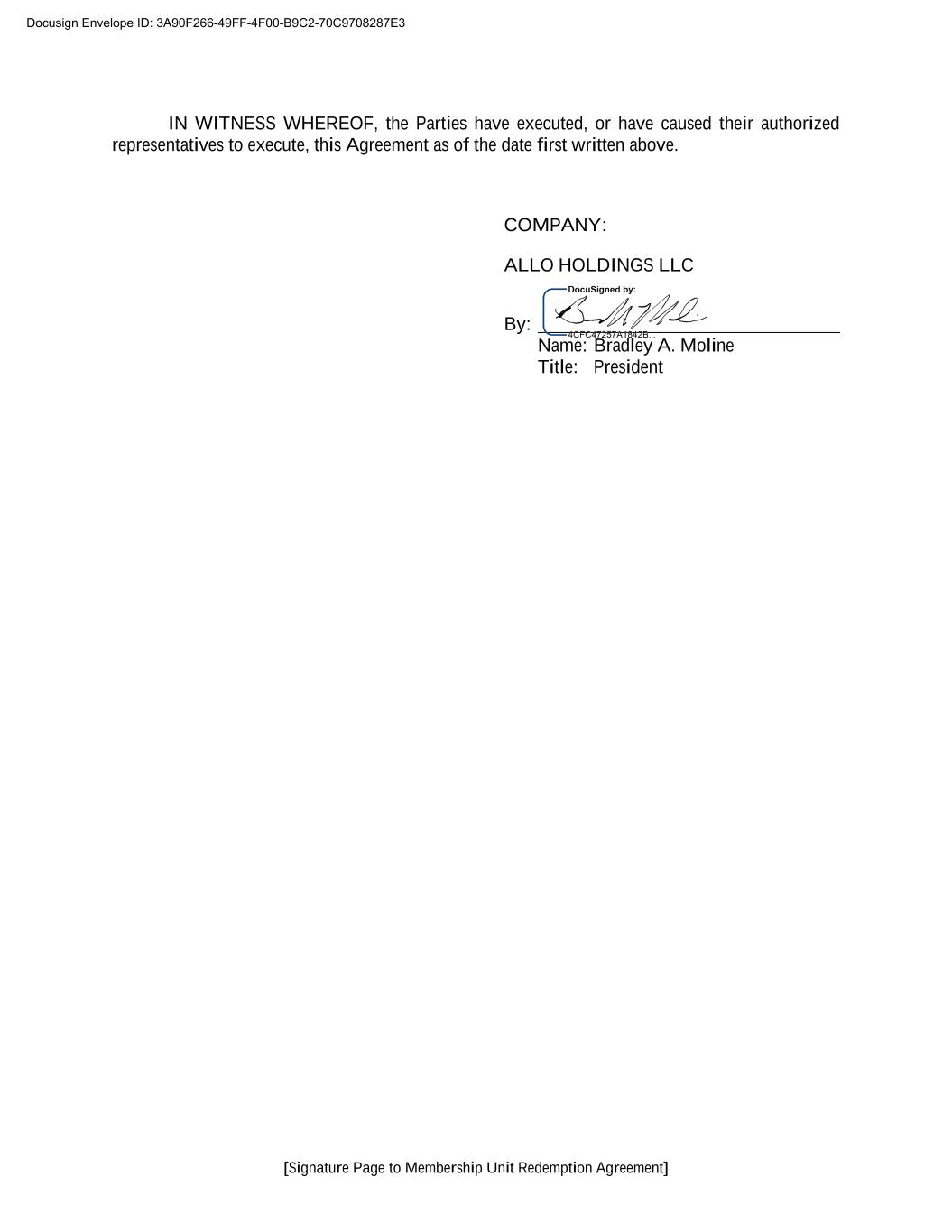 [Signature Page to Membership Unit Redemption Agreement] IN WITNESS WHEREOF, the Parties have executed, or have caused their authorized representatives to execute, this Agreement as of the date first written above. COMPANY: ALLO HOLDINGS LLC By: Name: Bradley A. Moline Title: President Docusign Envelope ID: 3A90F266-49FF-4F00-B9C2-70C9708287E3