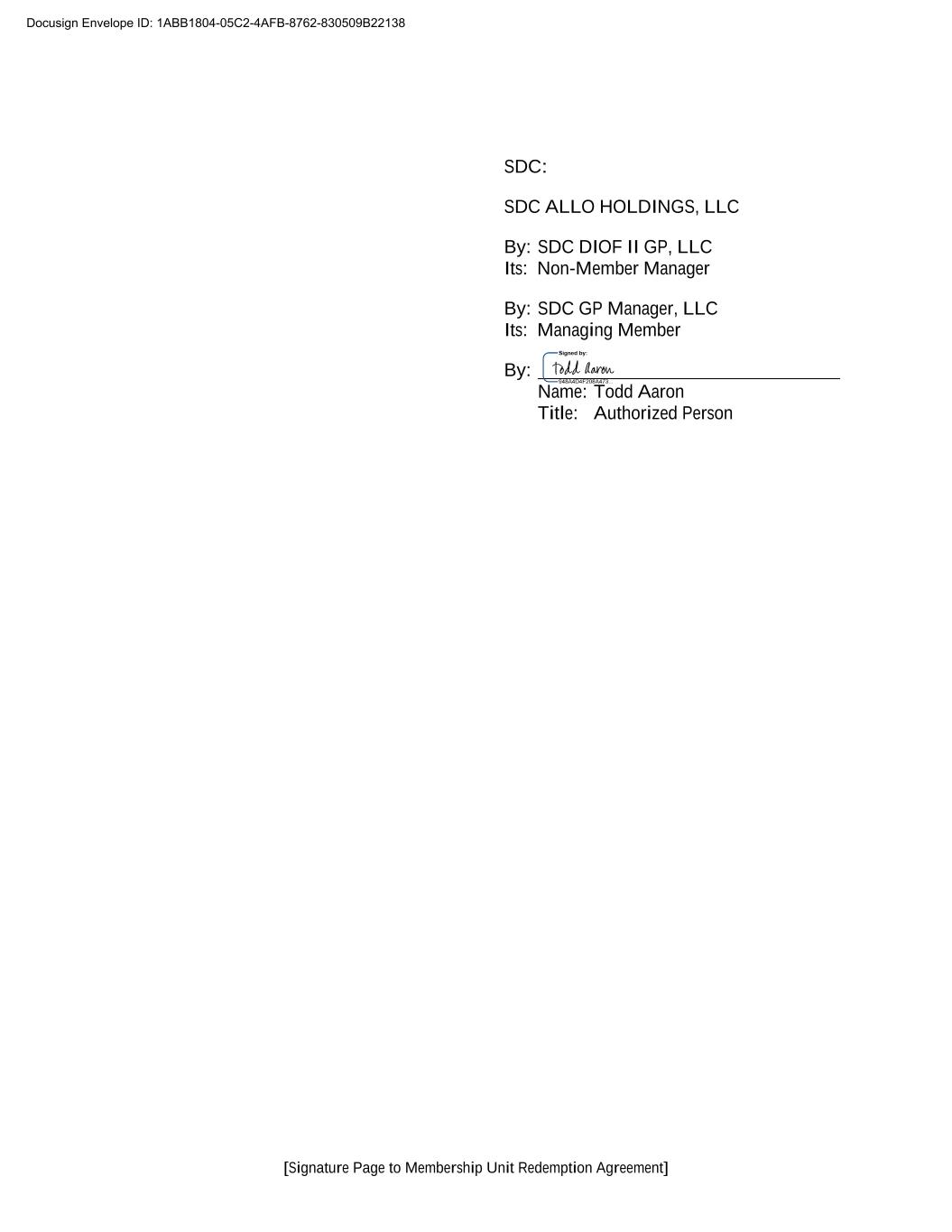 [Signature Page to Membership Unit Redemption Agreement] SDC: SDC ALLO HOLDINGS, LLC By: SDC DIOF II GP, LLC Its: Non-Member Manager By: SDC GP Manager, LLC Its: Managing Member By: Name: Todd Aaron Title: Authorized Person Docusign Envelope ID: 1ABB1804-05C2-4AFB-8762-830509B22138