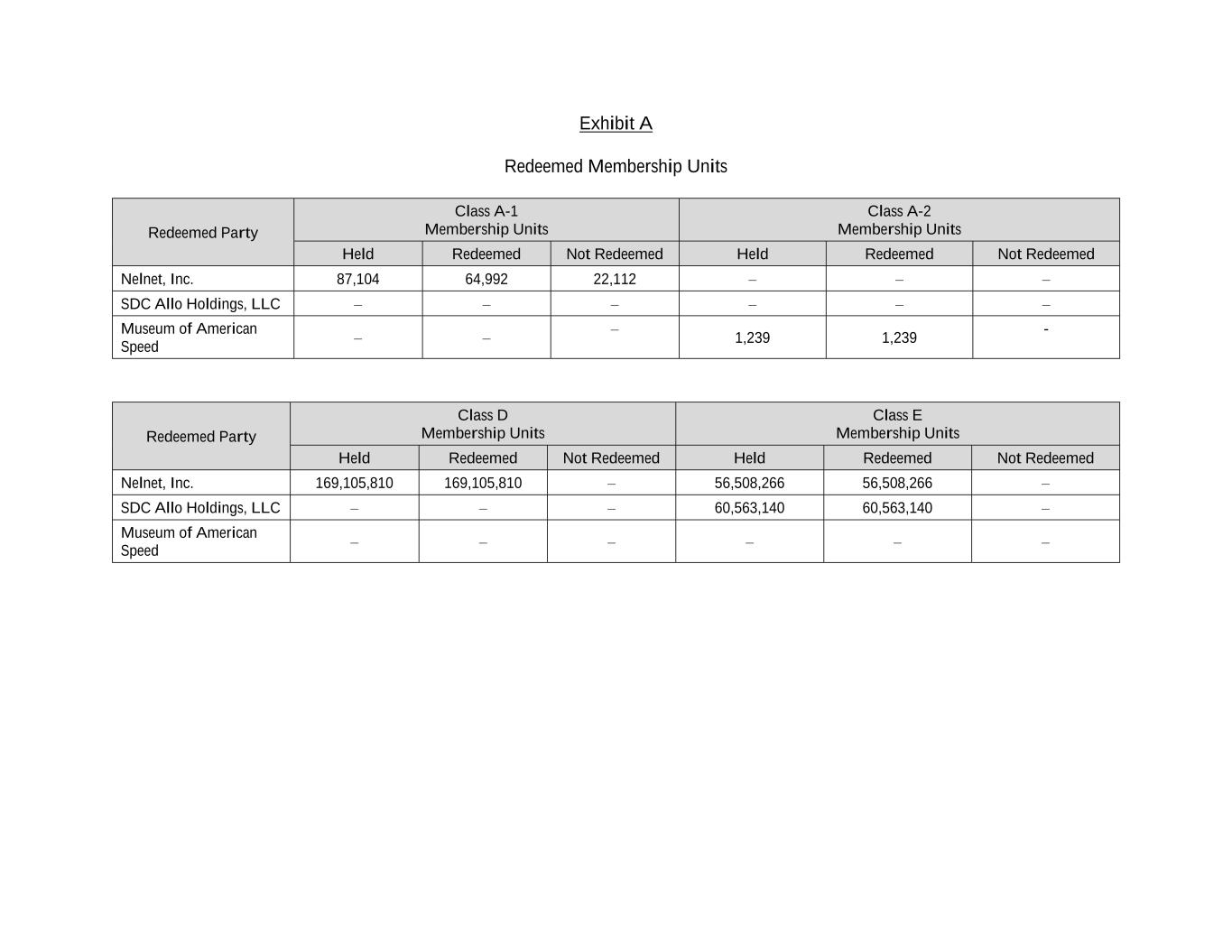 Exhibit A Redeemed Membership Units Redeemed Party Class A-1 Membership Units Class A-2 Membership Units Held Redeemed Not Redeemed Held Redeemed Not Redeemed Nelnet, Inc. 87,104 64,992 22,112 – – – SDC Allo Holdings, LLC – – – – – – Museum of American Speed – – – 1,239 1,239 - Redeemed Party Class D Membership Units Class E Membership Units Held Redeemed Not Redeemed Held Redeemed Not Redeemed Nelnet, Inc. 169,105,810 169,105,810 – 56,508,266 56,508,266 – SDC Allo Holdings, LLC – – – 60,563,140 60,563,140 – Museum of American Speed – – – – – –