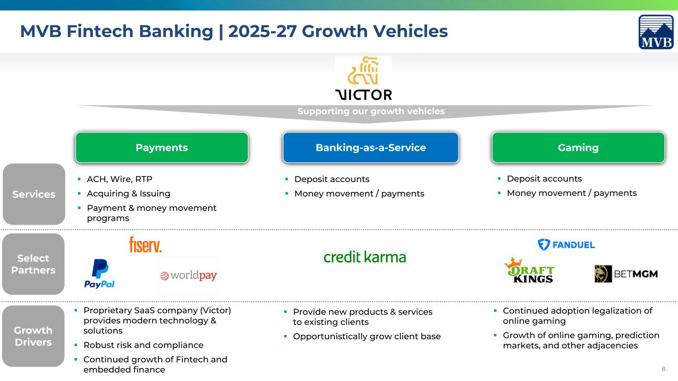 8 MVB Fintech Banking | 2025-27 Growth Vehicles Banking-as-a-Service GamingPayments Supporting our growth vehicles ▪ ACH, Wire, RTP ▪ Acquiring & Issuing ▪ Payment & money movement programs ▪ Deposit accounts ▪ Money movement / payments ▪ Deposit accounts ▪ Money movement / payments ▪ Proprietary SaaS company (Victor) provides modern technology & solutions ▪ Robust risk and compliance ▪ Continued growth of Fintech and embedded finance ▪ Provide new products & services to existing clients ▪ Opportunistically grow client base ▪ Continued adoption legalization of online gaming ▪ Growth of online gaming, prediction markets, and other adjacencies Services Select Partners Growth Drivers