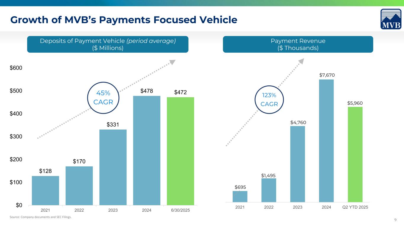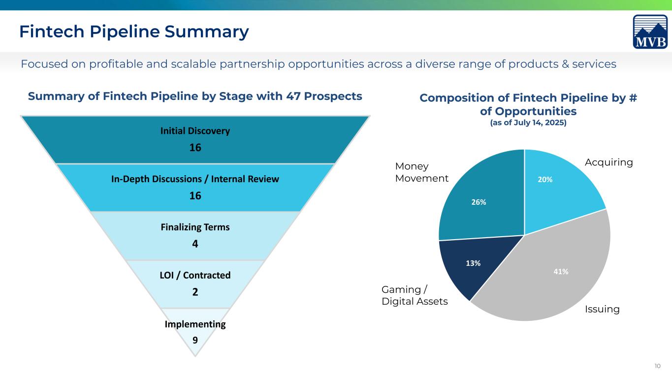 9 Growth of MVB’s Payments Focused Vehicle Source: Company documents and SEC Filings. $128 $170 $331 $478 $472 $0 $100 $200 $300 $400 $500 $600 2021 2022 2023 2024 6/30/2025 45% CAGR Payment Revenue ($ Thousands) Deposits of Payment Vehicle (period average) ($ Millions) $695 $1,495 $4,760 $7,670 $5,960 2021 2022 2023 2024 Q2 YTD 2025 123% CAGR