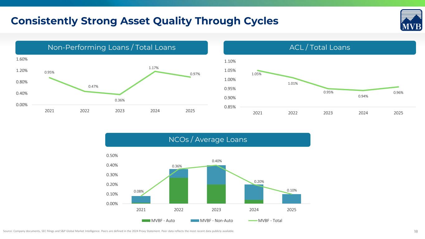 18 0.95% 0.47% 0.36% 1.17% 0.97% 0.00% 0.40% 0.80% 1.20% 1.60% 2021 2022 2023 2024 2025 Non-Performing Loans / Total Loans 0.08% 0.36% 0.40% 0.20% 0.10% 0.00% 0.10% 0.20% 0.30% 0.40% 0.50% 2021 2022 2023 2024 2025 MVBF - Auto MVBF - Non-Auto MVBF - Total NCOs / Average Loans Source: Company documents, SEC filings and S&P Global Market Intelligence. Peers are defined in the 2024 Proxy Statement. Peer data reflects the most recent data publicly available. 1.05% 1.01% 0.95% 0.94% 0.96% 0.85% 0.90% 0.95% 1.00% 1.05% 1.10% 2021 2022 2023 2024 2025 ACL / Total Loans Consistently Strong Asset Quality Through Cycles