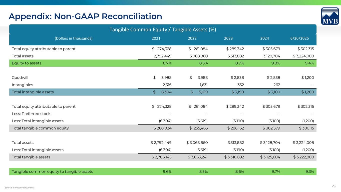 2 MVB Financial Corp. (“MVB” or the “Company”) has made forward-looking statements, within the meaning of Section 27A of the Securities Act of 1933, as amended, and Section 21E of the Securities Exchange Act of 1934, as amended, in this earnings release that are intended to be covered by the protections provided under the Private Securities Litigation Reform Act of 1995. These forward-looking statements are based on current expectations about the future and subject to risks and uncertainties. Forward-looking statements include, without limitation, information concerning possible or assumed future results of operations of the Company and its subsidiaries. Forward-looking statements can be identified by the use of words such as “may,” “could,” “should,”, “would,” “will,” “plans,” “believes,” “estimates,” “expects,” “anticipates,” “intends,” “continues,” or the negative of those terms or similar expressions. Note that many factors could affect the future financial results of the Company and its subsidiaries, both individually and collectively, and could cause those results to differ materially from those expressed in forward-looking statements. Therefore, undue reliance should not be placed upon any forward-looking statements. Those factors include but are not limited to: market, economic, operational, liquidity, and credit risk; changes in market interest rates; inability to successfully execute business plans, including strategies related to investments in financial technology companies; competition; unforeseen events, such as pandemics or natural disasters, and any governmental or societal responses thereto, changes in economic, business, and political conditions; changes in demand for loan products and deposit flow; changes in deposit classifications, operational risks and risk management failures; and government regulation and supervision. Further, we urge you to carefully review and consider the cautionary statements and disclosures, specifically those made in Part I, Item 1A, Risk Factors, of our Annual Report on Form 10-K for the year ended December 31, 2024 (the “2024 Form 10-K”), filed with the Securities and Exchange Commission ("SEC") on March 13, 2025, and from time to time, in our other filings with the SEC. Readers are cautioned not to place undue reliance on these forward-looking statements, which speak only as of the date of the stated report. Except to the extent required by law, we undertake no obligation to update any forward-looking statements in order to reflect any event or circumstance occurring after the date of this report or currently unknown facts or conditions or the occurrence of unanticipated events. All forward-looking statements are qualified in their entirety by this cautionary statement. Accounting standards require the consideration of subsequent events occurring after the balance sheet date for matters that require adjustment to, or disclosure in, the consolidated financial statements. The review period for subsequent events extends up to and including the filing date of a public company’s financial statements when filed with the SEC. Accordingly, the consolidated financial information in this announcement is subject to change. The Company uses certain non-GAAP financial measures, such as tangible book value per share and tangible common equity to tangible assets, to provide information useful to investors in understanding the Company’s operating performance and trends and to facilitate comparisons with the performance of the Company’s peers. The non-GAAP financial measures used may differ from the non-GAAP financial measures other financial institutions use to measure their results of operations. Non-GAAP financial measures should be viewed in addition to, and not as an alternative for, the Company’s reported results prepared in accordance with U.S. GAAP. Reconciliations of these non-GAAP financial measures to the most directly comparable U.S. GAAP financial measures are provided in the Appendix to this Presentation. Forward-Looking Statements