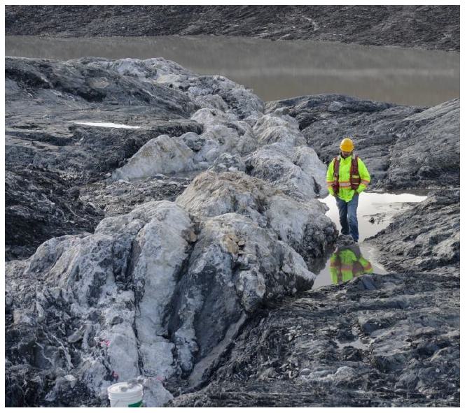 Technicians saw the channel along the cut line, producing two lines 5 cm apart and approximately 6-8 cm deep. The sample is removed from the bedrock and placed into sample bags. Individual sample bags are sealed and placed into totes, which are then sealed and marked with the contents.