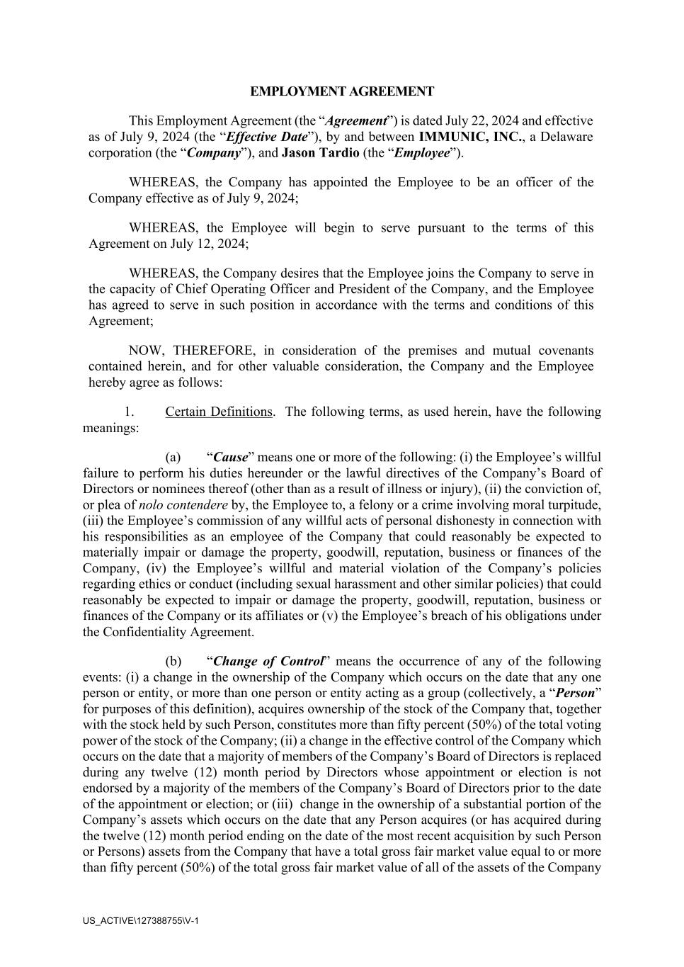 US_ACTIVE\127388755\V-1 EMPLOYMENT AGREEMENT This Employment Agreement (the “Agreement”) is dated July 22, 2024 and effective as of July 9, 2024 (the “Effective Date”), by and between IMMUNIC, INC., a Delaware corporation (the “Company”), and Jason Tardio (the “Employee”). WHEREAS, the Company has appointed the Employee to be an officer of the Company effective as of July 9, 2024; WHEREAS, the Employee will begin to serve pursuant to the terms of this Agreement on July 12, 2024; WHEREAS, the Company desires that the Employee joins the Company to serve in the capacity of Chief Operating Officer and President of the Company, and the Employee has agreed to serve in such position in accordance with the terms and conditions of this Agreement; NOW, THEREFORE, in consideration of the premises and mutual covenants contained herein, and for other valuable consideration, the Company and the Employee hereby agree as follows: 1. Certain Definitions. The following terms, as used herein, have the following meanings: (a) “Cause” means one or more of the following: (i) the Employee’s willful failure to perform his duties hereunder or the lawful directives of the Company’s Board of Directors or nominees thereof (other than as a result of illness or injury), (ii) the conviction of, or plea of nolo contendere by, the Employee to, a felony or a crime involving moral turpitude, (iii) the Employee’s commission of any willful acts of personal dishonesty in connection with his responsibilities as an employee of the Company that could reasonably be expected to materially impair or damage the property, goodwill, reputation, business or finances of the Company, (iv) the Employee’s willful and material violation of the Company’s policies regarding ethics or conduct (including sexual harassment and other similar policies) that could reasonably be expected to impair or damage the property, goodwill, reputation, business or finances of the Company or its affiliates or (v) the Employee’s breach of his obligations under the Confidentiality Agreement. (b) “Change of Control” means the occurrence of any of the following events: (i) a change in the ownership of the Company which occurs on the date that any one person or entity, or more than one person or entity acting as a group (collectively, a “Person” for purposes of this definition), acquires ownership of the stock of the Company that, together with the stock held by such Person, constitutes more than fifty percent (50%) of the total voting power of the stock of the Company; (ii) a change in the effective control of the Company which occurs on the date that a majority of members of the Company’s Board of Directors is replaced during any twelve (12) month period by Directors whose appointment or election is not endorsed by a majority of the members of the Company’s Board of Directors prior to the date of the appointment or election; or (iii) change in the ownership of a substantial portion of the Company’s assets which occurs on the date that any Person acquires (or has acquired during the twelve (12) month period ending on the date of the most recent acquisition by such Person or Persons) assets from the Company that have a total gross fair market value equal to or more than fifty percent (50%) of the total gross fair market value of all of the assets of the Company