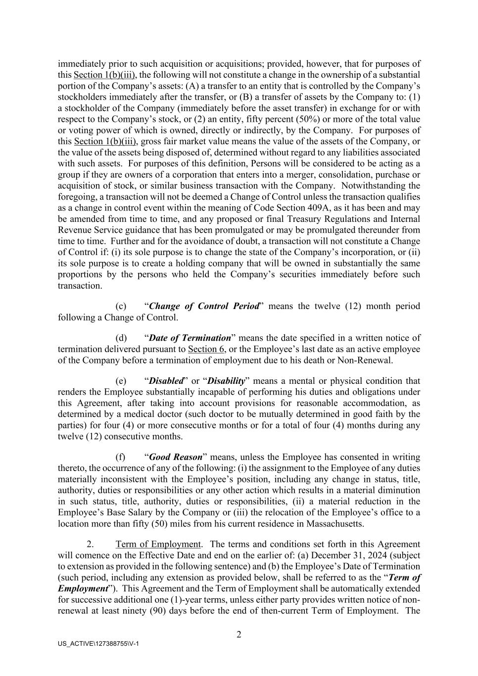 2 US_ACTIVE\127388755\V-1 immediately prior to such acquisition or acquisitions; provided, however, that for purposes of this Section 1(b)(iii), the following will not constitute a change in the ownership of a substantial portion of the Company’s assets: (A) a transfer to an entity that is controlled by the Company’s stockholders immediately after the transfer, or (B) a transfer of assets by the Company to: (1) a stockholder of the Company (immediately before the asset transfer) in exchange for or with respect to the Company’s stock, or (2) an entity, fifty percent (50%) or more of the total value or voting power of which is owned, directly or indirectly, by the Company. For purposes of this Section 1(b)(iii), gross fair market value means the value of the assets of the Company, or the value of the assets being disposed of, determined without regard to any liabilities associated with such assets. For purposes of this definition, Persons will be considered to be acting as a group if they are owners of a corporation that enters into a merger, consolidation, purchase or acquisition of stock, or similar business transaction with the Company. Notwithstanding the foregoing, a transaction will not be deemed a Change of Control unless the transaction qualifies as a change in control event within the meaning of Code Section 409A, as it has been and may be amended from time to time, and any proposed or final Treasury Regulations and Internal Revenue Service guidance that has been promulgated or may be promulgated thereunder from time to time. Further and for the avoidance of doubt, a transaction will not constitute a Change of Control if: (i) its sole purpose is to change the state of the Company’s incorporation, or (ii) its sole purpose is to create a holding company that will be owned in substantially the same proportions by the persons who held the Company’s securities immediately before such transaction. (c) “Change of Control Period” means the twelve (12) month period following a Change of Control. (d) “Date of Termination” means the date specified in a written notice of termination delivered pursuant to Section 6, or the Employee’s last date as an active employee of the Company before a termination of employment due to his death or Non-Renewal. (e) “Disabled” or “Disability” means a mental or physical condition that renders the Employee substantially incapable of performing his duties and obligations under this Agreement, after taking into account provisions for reasonable accommodation, as determined by a medical doctor (such doctor to be mutually determined in good faith by the parties) for four (4) or more consecutive months or for a total of four (4) months during any twelve (12) consecutive months. (f) “Good Reason” means, unless the Employee has consented in writing thereto, the occurrence of any of the following: (i) the assignment to the Employee of any duties materially inconsistent with the Employee’s position, including any change in status, title, authority, duties or responsibilities or any other action which results in a material diminution in such status, title, authority, duties or responsibilities, (ii) a material reduction in the Employee’s Base Salary by the Company or (iii) the relocation of the Employee’s office to a location more than fifty (50) miles from his current residence in Massachusetts. 2. Term of Employment. The terms and conditions set forth in this Agreement will comence on the Effective Date and end on the earlier of: (a) December 31, 2024 (subject to extension as provided in the following sentence) and (b) the Employee’s Date of Termination (such period, including any extension as provided below, shall be referred to as the “Term of Employment”). This Agreement and the Term of Employment shall be automatically extended for successive additional one (1)-year terms, unless either party provides written notice of non- renewal at least ninety (90) days before the end of then-current Term of Employment. The