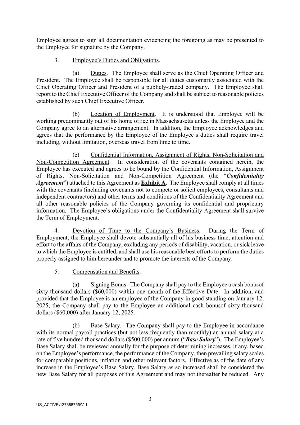 3 US_ACTIVE\127388755\V-1 Employee agrees to sign all documentation evidencing the foregoing as may be presented to the Employee for signature by the Company. 3. Employee’s Duties and Obligations. (a) Duties. The Employee shall serve as the Chief Operating Officer and President. The Employee shall be responsible for all duties customarily associated with the Chief Operating Officer and President of a publicly-traded company. The Employee shall report to the Chief Executive Officer of the Company and shall be subject to reasonable policies established by such Chief Executive Officer. (b) Location of Employment. It is understood that Employee will be working predominantly out of his home office in Massachsusetts unless the Employee and the Company agree to an alternative arrangement. In addition, the Employee acknowledges and agrees that the performance by the Employee of the Employee’s duties shall require travel including, without limitation, overseas travel from time to time. (c) Confidential Information, Assignment of Rights, Non-Solicitation and Non-Competition Agreement. In consideration of the covenants contained herein, the Employee has executed and agrees to be bound by the Confidential Information, Assignment of Rights, Non-Solicitation and Non-Competition Agreement (the “Confidentiality Agreement”) attached to this Agreement as Exhibit A. The Employee shall comply at all times with the covenants (including covenants not to compete or solicit employees, consultants and independent contractors) and other terms and conditions of the Confidentiality Agreement and all other reasonable policies of the Company governing its confidential and proprietary information. The Employee’s obligations under the Confidentiality Agreement shall survive the Term of Employment. 4. Devotion of Time to the Company’s Business. During the Term of Employment, the Employee shall devote substantially all of his business time, attention and effort to the affairs of the Company, excluding any periods of disability, vacation, or sick leave to which the Employee is entitled, and shall use his reasonable best efforts to perform the duties properly assigned to him hereunder and to promote the interests of the Company. 5. Compensation and Benefits. (a) Signing Bonus. The Company shall pay to the Employee a cash bonusof sixty-thousand dollars ($60,000) within one month of the Effective Date. In addition, and provided that the Employee is an employee of the Company in good standing on January 12, 2025, the Company shall pay to the Employee an additional cash bonusof sixty-thousand dollars ($60,000) after January 12, 2025. (b) Base Salary. The Company shall pay to the Employee in accordance with its normal payroll practices (but not less frequently than monthly) an annual salary at a rate of five hundred thousand dollars ($500,000) per annum (“Base Salary”). The Employee’s Base Salary shall be reviewed annually for the purpose of determining increases, if any, based on the Employee’s performance, the performance of the Company, then prevailing salary scales for comparable positions, inflation and other relevant factors. Effective as of the date of any increase in the Employee’s Base Salary, Base Salary as so increased shall be considered the new Base Salary for all purposes of this Agreement and may not thereafter be reduced. Any
