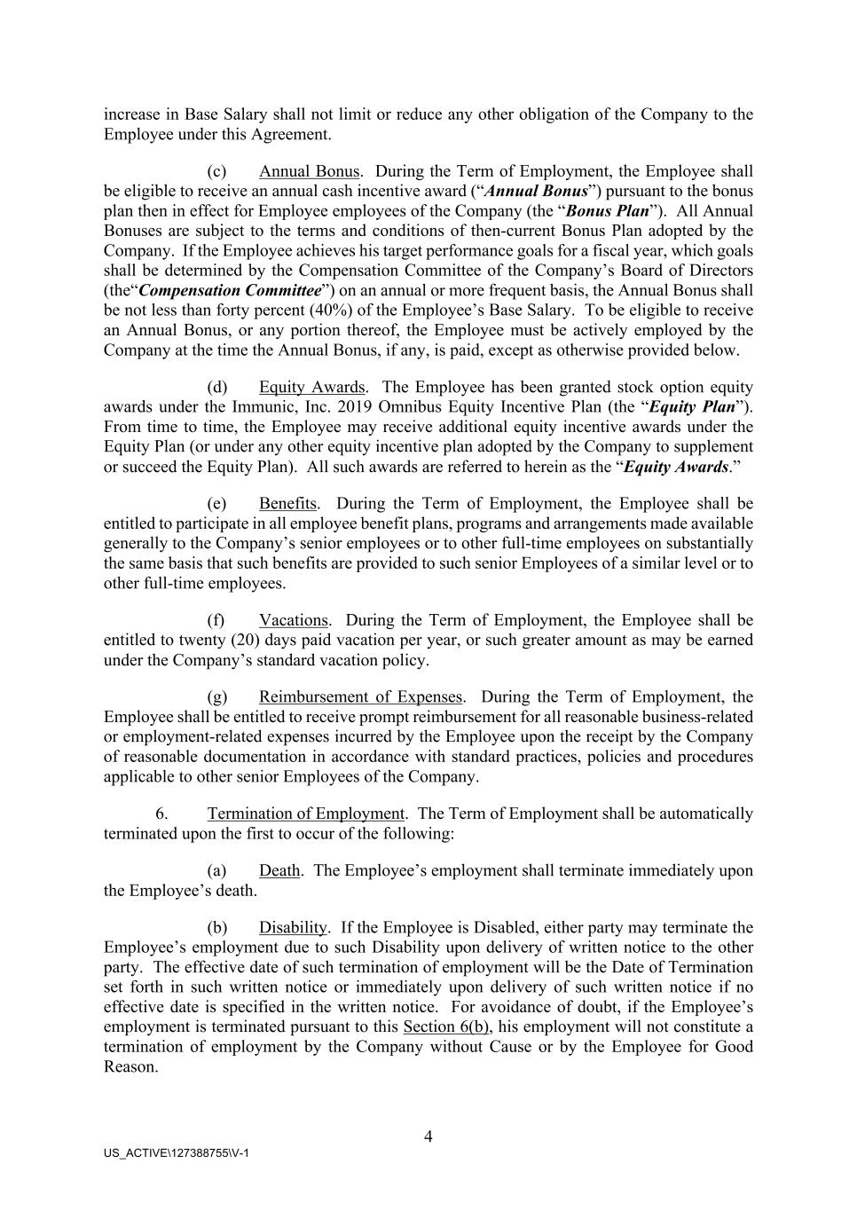 4 US_ACTIVE\127388755\V-1 increase in Base Salary shall not limit or reduce any other obligation of the Company to the Employee under this Agreement. (c) Annual Bonus. During the Term of Employment, the Employee shall be eligible to receive an annual cash incentive award (“Annual Bonus”) pursuant to the bonus plan then in effect for Employee employees of the Company (the “Bonus Plan”). All Annual Bonuses are subject to the terms and conditions of then-current Bonus Plan adopted by the Company. If the Employee achieves his target performance goals for a fiscal year, which goals shall be determined by the Compensation Committee of the Company’s Board of Directors (the“Compensation Committee”) on an annual or more frequent basis, the Annual Bonus shall be not less than forty percent (40%) of the Employee’s Base Salary. To be eligible to receive an Annual Bonus, or any portion thereof, the Employee must be actively employed by the Company at the time the Annual Bonus, if any, is paid, except as otherwise provided below. (d) Equity Awards. The Employee has been granted stock option equity awards under the Immunic, Inc. 2019 Omnibus Equity Incentive Plan (the “Equity Plan”). From time to time, the Employee may receive additional equity incentive awards under the Equity Plan (or under any other equity incentive plan adopted by the Company to supplement or succeed the Equity Plan). All such awards are referred to herein as the “Equity Awards.” (e) Benefits. During the Term of Employment, the Employee shall be entitled to participate in all employee benefit plans, programs and arrangements made available generally to the Company’s senior employees or to other full-time employees on substantially the same basis that such benefits are provided to such senior Employees of a similar level or to other full-time employees. (f) Vacations. During the Term of Employment, the Employee shall be entitled to twenty (20) days paid vacation per year, or such greater amount as may be earned under the Company’s standard vacation policy. (g) Reimbursement of Expenses. During the Term of Employment, the Employee shall be entitled to receive prompt reimbursement for all reasonable business-related or employment-related expenses incurred by the Employee upon the receipt by the Company of reasonable documentation in accordance with standard practices, policies and procedures applicable to other senior Employees of the Company. 6. Termination of Employment. The Term of Employment shall be automatically terminated upon the first to occur of the following: (a) Death. The Employee’s employment shall terminate immediately upon the Employee’s death. (b) Disability. If the Employee is Disabled, either party may terminate the Employee’s employment due to such Disability upon delivery of written notice to the other party. The effective date of such termination of employment will be the Date of Termination set forth in such written notice or immediately upon delivery of such written notice if no effective date is specified in the written notice. For avoidance of doubt, if the Employee’s employment is terminated pursuant to this Section 6(b), his employment will not constitute a termination of employment by the Company without Cause or by the Employee for Good Reason.