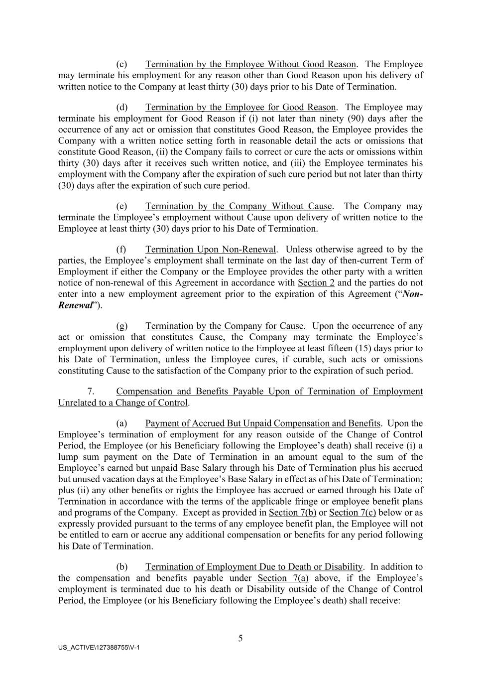 5 US_ACTIVE\127388755\V-1 (c) Termination by the Employee Without Good Reason. The Employee may terminate his employment for any reason other than Good Reason upon his delivery of written notice to the Company at least thirty (30) days prior to his Date of Termination. (d) Termination by the Employee for Good Reason. The Employee may terminate his employment for Good Reason if (i) not later than ninety (90) days after the occurrence of any act or omission that constitutes Good Reason, the Employee provides the Company with a written notice setting forth in reasonable detail the acts or omissions that constitute Good Reason, (ii) the Company fails to correct or cure the acts or omissions within thirty (30) days after it receives such written notice, and (iii) the Employee terminates his employment with the Company after the expiration of such cure period but not later than thirty (30) days after the expiration of such cure period. (e) Termination by the Company Without Cause. The Company may terminate the Employee’s employment without Cause upon delivery of written notice to the Employee at least thirty (30) days prior to his Date of Termination. (f) Termination Upon Non-Renewal. Unless otherwise agreed to by the parties, the Employee’s employment shall terminate on the last day of then-current Term of Employment if either the Company or the Employee provides the other party with a written notice of non-renewal of this Agreement in accordance with Section 2 and the parties do not enter into a new employment agreement prior to the expiration of this Agreement (“Non- Renewal”). (g) Termination by the Company for Cause. Upon the occurrence of any act or omission that constitutes Cause, the Company may terminate the Employee’s employment upon delivery of written notice to the Employee at least fifteen (15) days prior to his Date of Termination, unless the Employee cures, if curable, such acts or omissions constituting Cause to the satisfaction of the Company prior to the expiration of such period. 7. Compensation and Benefits Payable Upon of Termination of Employment Unrelated to a Change of Control. (a) Payment of Accrued But Unpaid Compensation and Benefits. Upon the Employee’s termination of employment for any reason outside of the Change of Control Period, the Employee (or his Beneficiary following the Employee’s death) shall receive (i) a lump sum payment on the Date of Termination in an amount equal to the sum of the Employee’s earned but unpaid Base Salary through his Date of Termination plus his accrued but unused vacation days at the Employee’s Base Salary in effect as of his Date of Termination; plus (ii) any other benefits or rights the Employee has accrued or earned through his Date of Termination in accordance with the terms of the applicable fringe or employee benefit plans and programs of the Company. Except as provided in Section 7(b) or Section 7(c) below or as expressly provided pursuant to the terms of any employee benefit plan, the Employee will not be entitled to earn or accrue any additional compensation or benefits for any period following his Date of Termination. (b) Termination of Employment Due to Death or Disability. In addition to the compensation and benefits payable under Section 7(a) above, if the Employee’s employment is terminated due to his death or Disability outside of the Change of Control Period, the Employee (or his Beneficiary following the Employee’s death) shall receive: