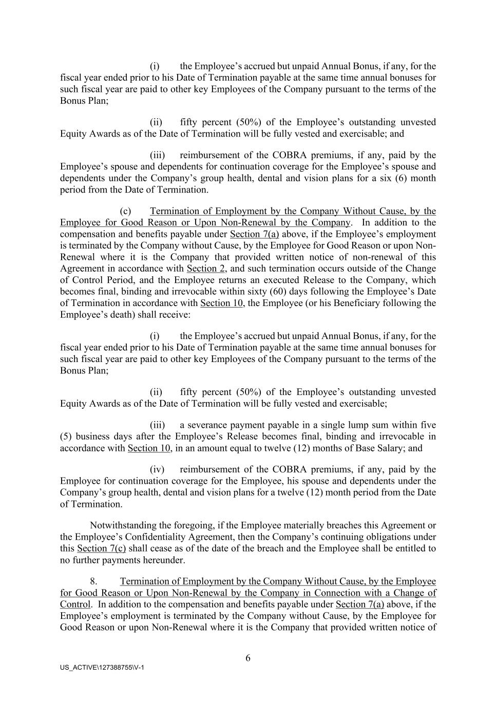 6 US_ACTIVE\127388755\V-1 (i) the Employee’s accrued but unpaid Annual Bonus, if any, for the fiscal year ended prior to his Date of Termination payable at the same time annual bonuses for such fiscal year are paid to other key Employees of the Company pursuant to the terms of the Bonus Plan; (ii) fifty percent (50%) of the Employee’s outstanding unvested Equity Awards as of the Date of Termination will be fully vested and exercisable; and (iii) reimbursement of the COBRA premiums, if any, paid by the Employee’s spouse and dependents for continuation coverage for the Employee’s spouse and dependents under the Company’s group health, dental and vision plans for a six (6) month period from the Date of Termination. (c) Termination of Employment by the Company Without Cause, by the Employee for Good Reason or Upon Non-Renewal by the Company. In addition to the compensation and benefits payable under Section 7(a) above, if the Employee’s employment is terminated by the Company without Cause, by the Employee for Good Reason or upon Non- Renewal where it is the Company that provided written notice of non-renewal of this Agreement in accordance with Section 2, and such termination occurs outside of the Change of Control Period, and the Employee returns an executed Release to the Company, which becomes final, binding and irrevocable within sixty (60) days following the Employee’s Date of Termination in accordance with Section 10, the Employee (or his Beneficiary following the Employee’s death) shall receive: (i) the Employee’s accrued but unpaid Annual Bonus, if any, for the fiscal year ended prior to his Date of Termination payable at the same time annual bonuses for such fiscal year are paid to other key Employees of the Company pursuant to the terms of the Bonus Plan; (ii) fifty percent (50%) of the Employee’s outstanding unvested Equity Awards as of the Date of Termination will be fully vested and exercisable; (iii) a severance payment payable in a single lump sum within five (5) business days after the Employee’s Release becomes final, binding and irrevocable in accordance with Section 10, in an amount equal to twelve (12) months of Base Salary; and (iv) reimbursement of the COBRA premiums, if any, paid by the Employee for continuation coverage for the Employee, his spouse and dependents under the Company’s group health, dental and vision plans for a twelve (12) month period from the Date of Termination. Notwithstanding the foregoing, if the Employee materially breaches this Agreement or the Employee’s Confidentiality Agreement, then the Company’s continuing obligations under this Section 7(c) shall cease as of the date of the breach and the Employee shall be entitled to no further payments hereunder. 8. Termination of Employment by the Company Without Cause, by the Employee for Good Reason or Upon Non-Renewal by the Company in Connection with a Change of Control. In addition to the compensation and benefits payable under Section 7(a) above, if the Employee’s employment is terminated by the Company without Cause, by the Employee for Good Reason or upon Non-Renewal where it is the Company that provided written notice of