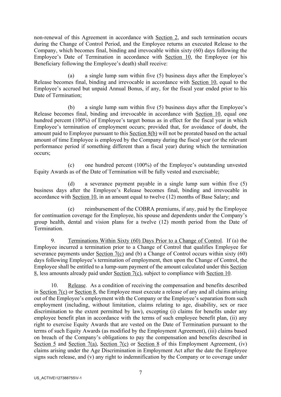 7 US_ACTIVE\127388755\V-1 non-renewal of this Agreement in accordance with Section 2, and such termination occurs during the Change of Control Period, and the Employee returns an executed Release to the Company, which becomes final, binding and irrevocable within sixty (60) days following the Employee’s Date of Termination in accordance with Section 10, the Employee (or his Beneficiary following the Employee’s death) shall receive: (a) a single lump sum within five (5) business days after the Employee’s Release becomes final, binding and irrevocable in accordance with Section 10, equal to the Employee’s accrued but unpaid Annual Bonus, if any, for the fiscal year ended prior to his Date of Termination; (b) a single lump sum within five (5) business days after the Employee’s Release becomes final, binding and irrevocable in accordance with Section 10, equal one hundred percent (100%) of Employee’s target bonus as in effect for the fiscal year in which Employee’s termination of employment occurs; provided that, for avoidance of doubt, the amount paid to Employee pursuant to this Section 8(b) will not be prorated based on the actual amount of time Employee is employed by the Company during the fiscal year (or the relevant performance period if something different than a fiscal year) during which the termination occurs; (c) one hundred percent (100%) of the Employee’s outstanding unvested Equity Awards as of the Date of Termination will be fully vested and exercisable; (d) a severance payment payable in a single lump sum within five (5) business days after the Employee’s Release becomes final, binding and irrevocable in accordance with Section 10, in an amount equal to twelve (12) months of Base Salary; and (e) reimbursement of the COBRA premiums, if any, paid by the Employee for continuation coverage for the Employee, his spouse and dependents under the Company’s group health, dental and vision plans for a twelve (12) month period from the Date of Termination. 9. Terminations Within Sixty (60) Days Prior to a Change of Control. If (a) the Employee incurred a termination prior to a Change of Control that qualifies Employee for severance payments under Section 7(c) and (b) a Change of Control occurs within sixty (60) days following Employee’s termination of employment, then upon the Change of Control, the Employee shall be entitled to a lump-sum payment of the amount calculated under this Section 8, less amounts already paid under Section 7(c), subject to compliance with Section 10. 10. Release. As a condition of receiving the compensation and benefits described in Section 7(c) or Section 8, the Employee must execute a release of any and all claims arising out of the Employee’s employment with the Company or the Employee’s separation from such employment (including, without limitation, claims relating to age, disability, sex or race discrimination to the extent permitted by law), excepting (i) claims for benefits under any employee benefit plan in accordance with the terms of such employee benefit plan, (ii) any right to exercise Equity Awards that are vested on the Date of Termination pursuant to the terms of such Equity Awards (as modified by the Employment Agreement), (iii) claims based on breach of the Company’s obligations to pay the compensation and benefits described in Section 5 and Section 7(a), Section 7(c) or Section 8 of this Employment Agreement, (iv) claims arising under the Age Discrimination in Employment Act after the date the Employee signs such release, and (v) any right to indemnification by the Company or to coverage under