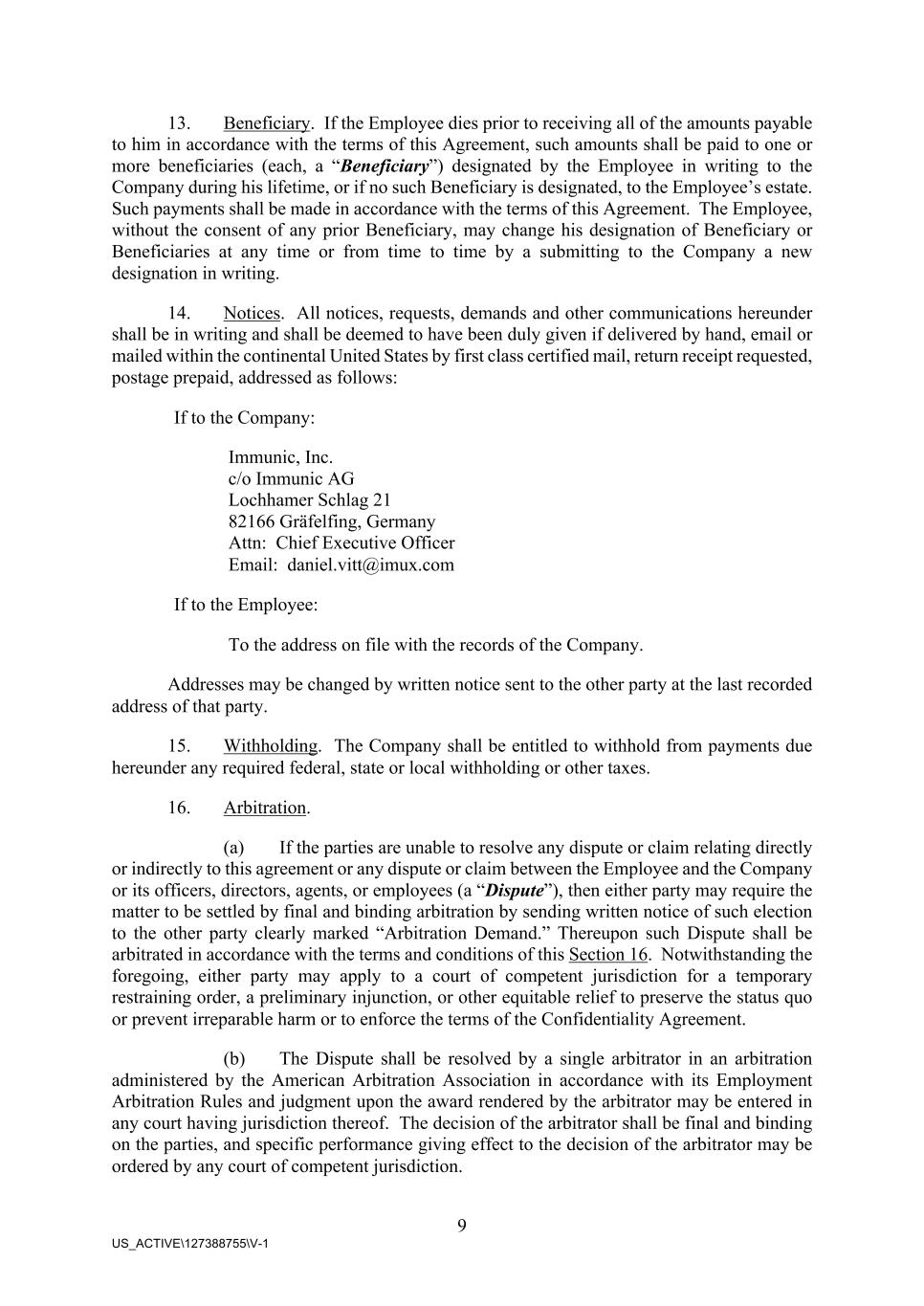 9 US_ACTIVE\127388755\V-1 13. Beneficiary. If the Employee dies prior to receiving all of the amounts payable to him in accordance with the terms of this Agreement, such amounts shall be paid to one or more beneficiaries (each, a “Beneficiary”) designated by the Employee in writing to the Company during his lifetime, or if no such Beneficiary is designated, to the Employee’s estate. Such payments shall be made in accordance with the terms of this Agreement. The Employee, without the consent of any prior Beneficiary, may change his designation of Beneficiary or Beneficiaries at any time or from time to time by a submitting to the Company a new designation in writing. 14. Notices. All notices, requests, demands and other communications hereunder shall be in writing and shall be deemed to have been duly given if delivered by hand, email or mailed within the continental United States by first class certified mail, return receipt requested, postage prepaid, addressed as follows: If to the Company: Immunic, Inc. c/o Immunic AG Lochhamer Schlag 21 82166 Gräfelfing, Germany Attn: Chief Executive Officer Email: daniel.vitt@imux.com If to the Employee: To the address on file with the records of the Company. Addresses may be changed by written notice sent to the other party at the last recorded address of that party. 15. Withholding. The Company shall be entitled to withhold from payments due hereunder any required federal, state or local withholding or other taxes. 16. Arbitration. (a) If the parties are unable to resolve any dispute or claim relating directly or indirectly to this agreement or any dispute or claim between the Employee and the Company or its officers, directors, agents, or employees (a “Dispute”), then either party may require the matter to be settled by final and binding arbitration by sending written notice of such election to the other party clearly marked “Arbitration Demand.” Thereupon such Dispute shall be arbitrated in accordance with the terms and conditions of this Section 16. Notwithstanding the foregoing, either party may apply to a court of competent jurisdiction for a temporary restraining order, a preliminary injunction, or other equitable relief to preserve the status quo or prevent irreparable harm or to enforce the terms of the Confidentiality Agreement. (b) The Dispute shall be resolved by a single arbitrator in an arbitration administered by the American Arbitration Association in accordance with its Employment Arbitration Rules and judgment upon the award rendered by the arbitrator may be entered in any court having jurisdiction thereof. The decision of the arbitrator shall be final and binding on the parties, and specific performance giving effect to the decision of the arbitrator may be ordered by any court of competent jurisdiction.