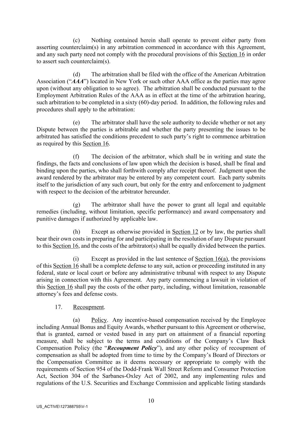 10 US_ACTIVE\127388755\V-1 (c) Nothing contained herein shall operate to prevent either party from asserting counterclaim(s) in any arbitration commenced in accordance with this Agreement, and any such party need not comply with the procedural provisions of this Section 16 in order to assert such counterclaim(s). (d) The arbitration shall be filed with the office of the American Arbitration Association (“AAA”) located in New York or such other AAA office as the parties may agree upon (without any obligation to so agree). The arbitration shall be conducted pursuant to the Employment Arbitration Rules of the AAA as in effect at the time of the arbitration hearing, such arbitration to be completed in a sixty (60)-day period. In addition, the following rules and procedures shall apply to the arbitration: (e) The arbitrator shall have the sole authority to decide whether or not any Dispute between the parties is arbitrable and whether the party presenting the issues to be arbitrated has satisfied the conditions precedent to such party’s right to commence arbitration as required by this Section 16. (f) The decision of the arbitrator, which shall be in writing and state the findings, the facts and conclusions of law upon which the decision is based, shall be final and binding upon the parties, who shall forthwith comply after receipt thereof. Judgment upon the award rendered by the arbitrator may be entered by any competent court. Each party submits itself to the jurisdiction of any such court, but only for the entry and enforcement to judgment with respect to the decision of the arbitrator hereunder. (g) The arbitrator shall have the power to grant all legal and equitable remedies (including, without limitation, specific performance) and award compensatory and punitive damages if authorized by applicable law. (h) Except as otherwise provided in Section 12 or by law, the parties shall bear their own costs in preparing for and participating in the resolution of any Dispute pursuant to this Section 16, and the costs of the arbitrator(s) shall be equally divided between the parties. (i) Except as provided in the last sentence of Section 16(a), the provisions of this Section 16 shall be a complete defense to any suit, action or proceeding instituted in any federal, state or local court or before any administrative tribunal with respect to any Dispute arising in connection with this Agreement. Any party commencing a lawsuit in violation of this Section 16 shall pay the costs of the other party, including, without limitation, reasonable attorney’s fees and defense costs. 17. Recoupment. (a) Policy. Any incentive-based compensation received by the Employee including Annual Bonus and Equity Awards, whether pursuant to this Agreement or otherwise, that is granted, earned or vested based in any part on attainment of a financial reporting measure, shall be subject to the terms and conditions of the Company’s Claw Back Compensation Policy (the “Recoupment Policy”), and any other policy of recoupment of compensation as shall be adopted from time to time by the Company’s Board of Directors or the Compensation Committee as it deems necessary or appropriate to comply with the requirements of Section 954 of the Dodd-Frank Wall Street Reform and Consumer Protection Act, Section 304 of the Sarbanes-Oxley Act of 2002, and any implementing rules and regulations of the U.S. Securities and Exchange Commission and applicable listing standards