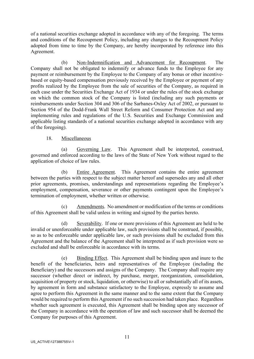 11 US_ACTIVE\127388755\V-1 of a national securities exchange adopted in accordance with any of the foregoing. The terms and conditions of the Recoupment Policy, including any changes to the Recoupment Policy adopted from time to time by the Company, are hereby incorporated by reference into this Agreement. (b) Non-Indemnification and Advancement for Recoupment. The Company shall not be obligated to indemnify or advance funds to the Employee for any payment or reimbursement by the Employee to the Company of any bonus or other incentive- based or equity-based compensation previously received by the Employee or payment of any profits realized by the Employee from the sale of securities of the Company, as required in each case under the Securities Exchange Act of 1934 or under the rules of the stock exchange on which the common stock of the Company is listed (including any such payments or reimbursements under Section 304 and 306 of the Sarbanes-Oxley Act of 2002, or pursuant to Section 954 of the Dodd-Frank Wall Street Reform and Consumer Protection Act and any implementing rules and regulations of the U.S. Securities and Exchange Commission and applicable listing standards of a national securities exchange adopted in accordance with any of the foregoing). 18. Miscellaneous (a) Governing Law. This Agreement shall be interpreted, construed, governed and enforced according to the laws of the State of New York without regard to the application of choice of law rules. (b) Entire Agreement. This Agreement contains the entire agreement between the parties with respect to the subject matter hereof and supersedes any and all other prior agreements, promises, understandings and representations regarding the Employee’s employment, compensation, severance or other payments contingent upon the Employee’s termination of employment, whether written or otherwise. (c) Amendments. No amendment or modification of the terms or conditions of this Agreement shall be valid unless in writing and signed by the parties hereto. (d) Severability. If one or more provisions of this Agreement are held to be invalid or unenforceable under applicable law, such provisions shall be construed, if possible, so as to be enforceable under applicable law, or such provisions shall be excluded from this Agreement and the balance of the Agreement shall be interpreted as if such provision were so excluded and shall be enforceable in accordance with its terms. (e) Binding Effect. This Agreement shall be binding upon and inure to the benefit of the beneficiaries, heirs and representatives of the Employee (including the Beneficiary) and the successors and assigns of the Company. The Company shall require any successor (whether direct or indirect, by purchase, merger, reorganization, consolidation, acquisition of property or stock, liquidation, or otherwise) to all or substantially all of its assets, by agreement in form and substance satisfactory to the Employee, expressly to assume and agree to perform this Agreement in the same manner and to the same extent that the Company would be required to perform this Agreement if no such succession had taken place. Regardless whether such agreement is executed, this Agreement shall be binding upon any successor of the Company in accordance with the operation of law and such successor shall be deemed the Company for purposes of this Agreement.