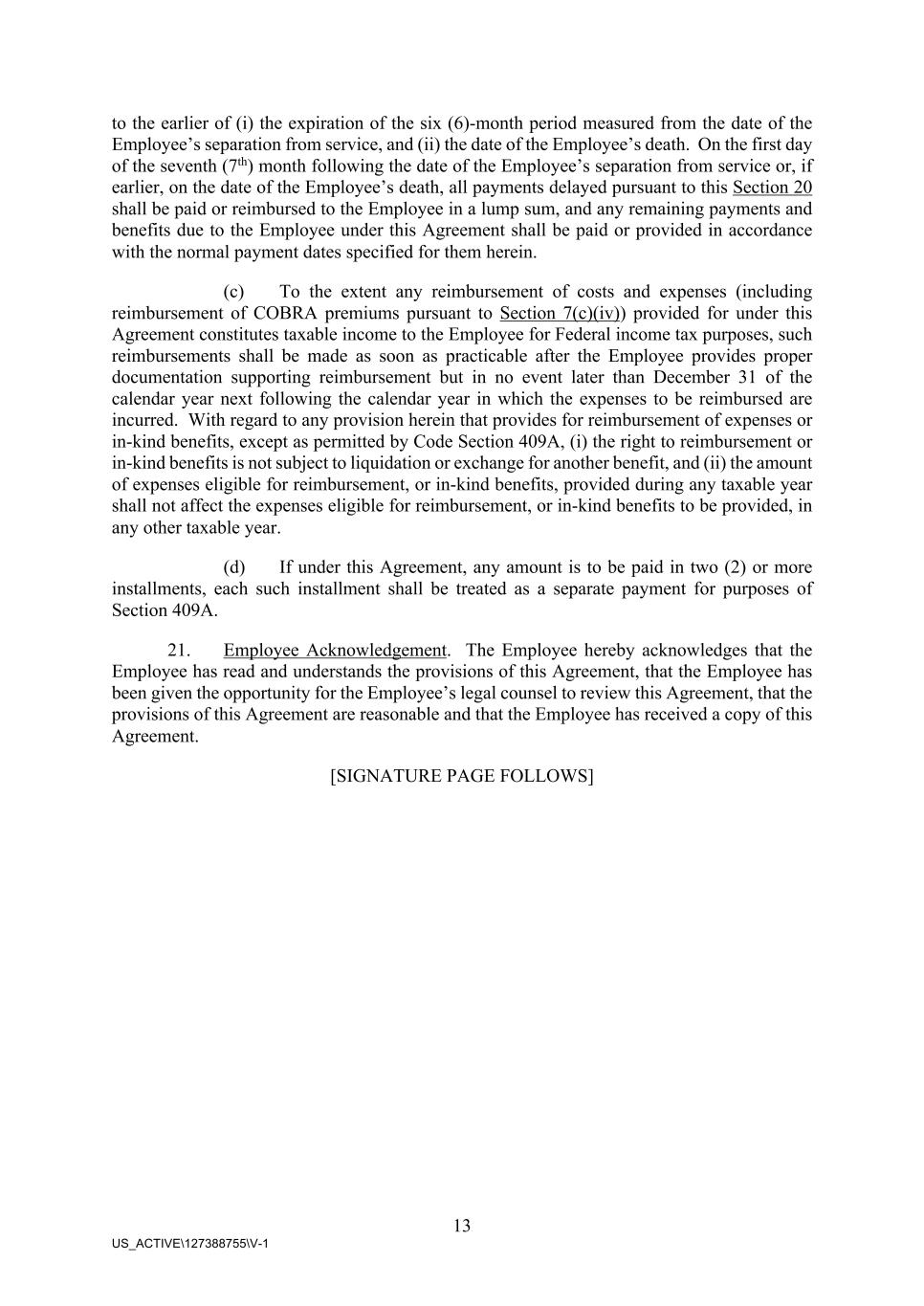 13 US_ACTIVE\127388755\V-1 to the earlier of (i) the expiration of the six (6)-month period measured from the date of the Employee’s separation from service, and (ii) the date of the Employee’s death. On the first day of the seventh (7th) month following the date of the Employee’s separation from service or, if earlier, on the date of the Employee’s death, all payments delayed pursuant to this Section 20 shall be paid or reimbursed to the Employee in a lump sum, and any remaining payments and benefits due to the Employee under this Agreement shall be paid or provided in accordance with the normal payment dates specified for them herein. (c) To the extent any reimbursement of costs and expenses (including reimbursement of COBRA premiums pursuant to Section 7(c)(iv)) provided for under this Agreement constitutes taxable income to the Employee for Federal income tax purposes, such reimbursements shall be made as soon as practicable after the Employee provides proper documentation supporting reimbursement but in no event later than December 31 of the calendar year next following the calendar year in which the expenses to be reimbursed are incurred. With regard to any provision herein that provides for reimbursement of expenses or in-kind benefits, except as permitted by Code Section 409A, (i) the right to reimbursement or in-kind benefits is not subject to liquidation or exchange for another benefit, and (ii) the amount of expenses eligible for reimbursement, or in-kind benefits, provided during any taxable year shall not affect the expenses eligible for reimbursement, or in-kind benefits to be provided, in any other taxable year. (d) If under this Agreement, any amount is to be paid in two (2) or more installments, each such installment shall be treated as a separate payment for purposes of Section 409A. 21. Employee Acknowledgement. The Employee hereby acknowledges that the Employee has read and understands the provisions of this Agreement, that the Employee has been given the opportunity for the Employee’s legal counsel to review this Agreement, that the provisions of this Agreement are reasonable and that the Employee has received a copy of this Agreement. [SIGNATURE PAGE FOLLOWS]