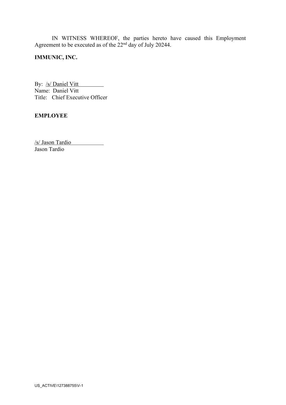 US_ACTIVE\127388755\V-1 IN WITNESS WHEREOF, the parties hereto have caused this Employment Agreement to be executed as of the 22nd day of July 20244. IMMUNIC, INC. By: /s/ Daniel Vitt Name: Daniel Vitt Title: Chief Executive Officer EMPLOYEE /s/ Jason Tardio Jason Tardio