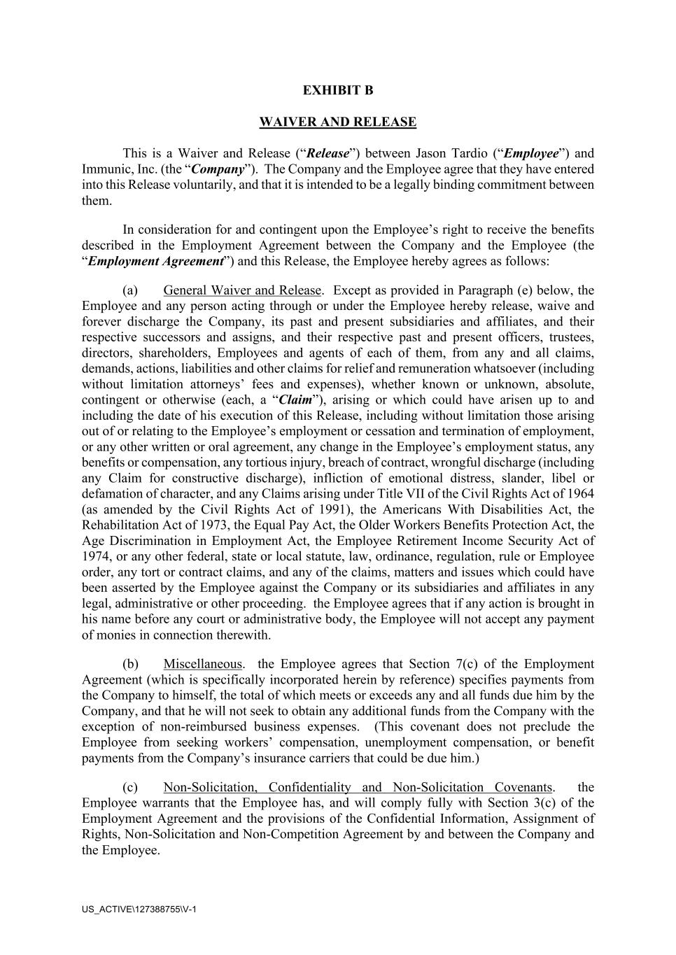 US_ACTIVE\127388755\V-1 EXHIBIT B WAIVER AND RELEASE This is a Waiver and Release (“Release”) between Jason Tardio (“Employee”) and Immunic, Inc. (the “Company”). The Company and the Employee agree that they have entered into this Release voluntarily, and that it is intended to be a legally binding commitment between them. In consideration for and contingent upon the Employee’s right to receive the benefits described in the Employment Agreement between the Company and the Employee (the “Employment Agreement”) and this Release, the Employee hereby agrees as follows: (a) General Waiver and Release. Except as provided in Paragraph (e) below, the Employee and any person acting through or under the Employee hereby release, waive and forever discharge the Company, its past and present subsidiaries and affiliates, and their respective successors and assigns, and their respective past and present officers, trustees, directors, shareholders, Employees and agents of each of them, from any and all claims, demands, actions, liabilities and other claims for relief and remuneration whatsoever (including without limitation attorneys’ fees and expenses), whether known or unknown, absolute, contingent or otherwise (each, a “Claim”), arising or which could have arisen up to and including the date of his execution of this Release, including without limitation those arising out of or relating to the Employee’s employment or cessation and termination of employment, or any other written or oral agreement, any change in the Employee’s employment status, any benefits or compensation, any tortious injury, breach of contract, wrongful discharge (including any Claim for constructive discharge), infliction of emotional distress, slander, libel or defamation of character, and any Claims arising under Title VII of the Civil Rights Act of 1964 (as amended by the Civil Rights Act of 1991), the Americans With Disabilities Act, the Rehabilitation Act of 1973, the Equal Pay Act, the Older Workers Benefits Protection Act, the Age Discrimination in Employment Act, the Employee Retirement Income Security Act of 1974, or any other federal, state or local statute, law, ordinance, regulation, rule or Employee order, any tort or contract claims, and any of the claims, matters and issues which could have been asserted by the Employee against the Company or its subsidiaries and affiliates in any legal, administrative or other proceeding. the Employee agrees that if any action is brought in his name before any court or administrative body, the Employee will not accept any payment of monies in connection therewith. (b) Miscellaneous. the Employee agrees that Section 7(c) of the Employment Agreement (which is specifically incorporated herein by reference) specifies payments from the Company to himself, the total of which meets or exceeds any and all funds due him by the Company, and that he will not seek to obtain any additional funds from the Company with the exception of non-reimbursed business expenses. (This covenant does not preclude the Employee from seeking workers’ compensation, unemployment compensation, or benefit payments from the Company’s insurance carriers that could be due him.) (c) Non-Solicitation, Confidentiality and Non-Solicitation Covenants. the Employee warrants that the Employee has, and will comply fully with Section 3(c) of the Employment Agreement and the provisions of the Confidential Information, Assignment of Rights, Non-Solicitation and Non-Competition Agreement by and between the Company and the Employee.