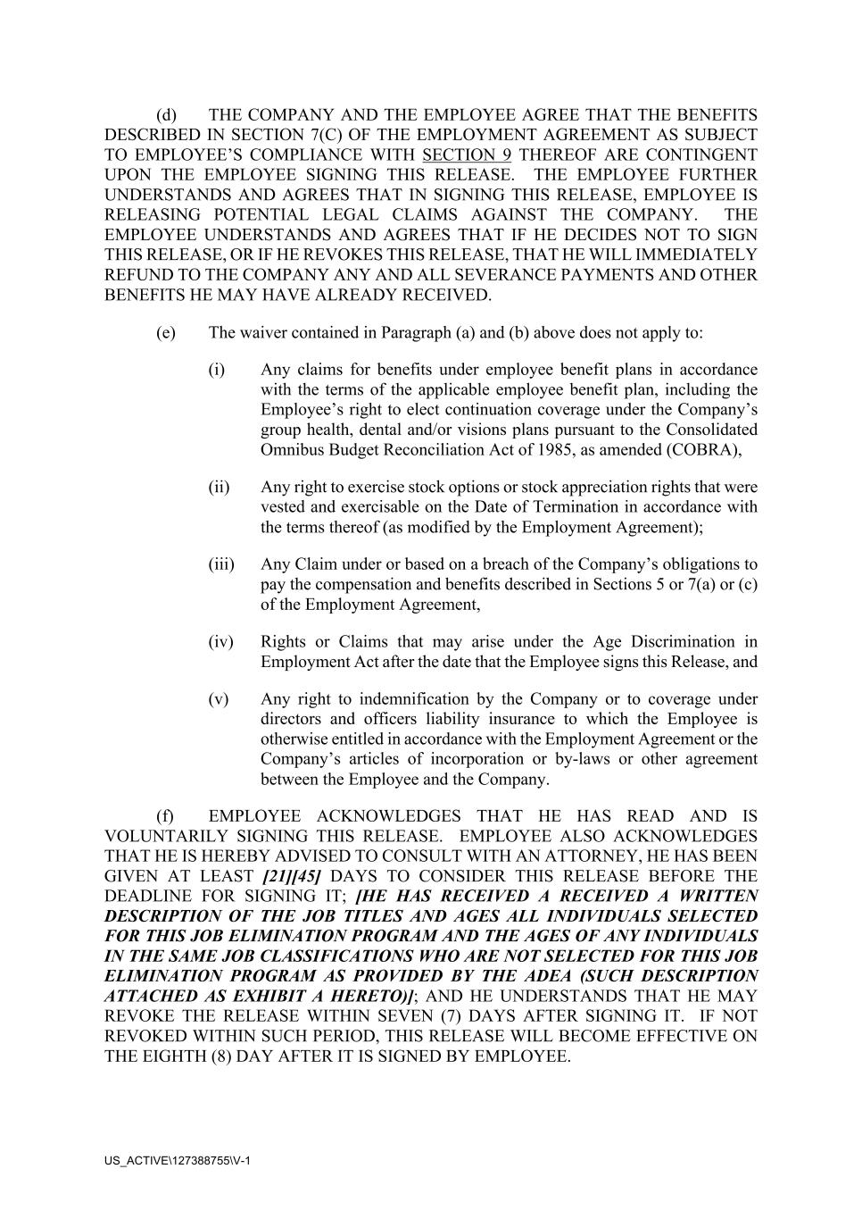 US_ACTIVE\127388755\V-1 (d) THE COMPANY AND THE EMPLOYEE AGREE THAT THE BENEFITS DESCRIBED IN SECTION 7(C) OF THE EMPLOYMENT AGREEMENT AS SUBJECT TO EMPLOYEE’S COMPLIANCE WITH SECTION 9 THEREOF ARE CONTINGENT UPON THE EMPLOYEE SIGNING THIS RELEASE. THE EMPLOYEE FURTHER UNDERSTANDS AND AGREES THAT IN SIGNING THIS RELEASE, EMPLOYEE IS RELEASING POTENTIAL LEGAL CLAIMS AGAINST THE COMPANY. THE EMPLOYEE UNDERSTANDS AND AGREES THAT IF HE DECIDES NOT TO SIGN THIS RELEASE, OR IF HE REVOKES THIS RELEASE, THAT HE WILL IMMEDIATELY REFUND TO THE COMPANY ANY AND ALL SEVERANCE PAYMENTS AND OTHER BENEFITS HE MAY HAVE ALREADY RECEIVED. (e) The waiver contained in Paragraph (a) and (b) above does not apply to: (i) Any claims for benefits under employee benefit plans in accordance with the terms of the applicable employee benefit plan, including the Employee’s right to elect continuation coverage under the Company’s group health, dental and/or visions plans pursuant to the Consolidated Omnibus Budget Reconciliation Act of 1985, as amended (COBRA), (ii) Any right to exercise stock options or stock appreciation rights that were vested and exercisable on the Date of Termination in accordance with the terms thereof (as modified by the Employment Agreement); (iii) Any Claim under or based on a breach of the Company’s obligations to pay the compensation and benefits described in Sections 5 or 7(a) or (c) of the Employment Agreement, (iv) Rights or Claims that may arise under the Age Discrimination in Employment Act after the date that the Employee signs this Release, and (v) Any right to indemnification by the Company or to coverage under directors and officers liability insurance to which the Employee is otherwise entitled in accordance with the Employment Agreement or the Company’s articles of incorporation or by-laws or other agreement between the Employee and the Company. (f) EMPLOYEE ACKNOWLEDGES THAT HE HAS READ AND IS VOLUNTARILY SIGNING THIS RELEASE. EMPLOYEE ALSO ACKNOWLEDGES THAT HE IS HEREBY ADVISED TO CONSULT WITH AN ATTORNEY, HE HAS BEEN GIVEN AT LEAST [21][45] DAYS TO CONSIDER THIS RELEASE BEFORE THE DEADLINE FOR SIGNING IT; [HE HAS RECEIVED A RECEIVED A WRITTEN DESCRIPTION OF THE JOB TITLES AND AGES ALL INDIVIDUALS SELECTED FOR THIS JOB ELIMINATION PROGRAM AND THE AGES OF ANY INDIVIDUALS IN THE SAME JOB CLASSIFICATIONS WHO ARE NOT SELECTED FOR THIS JOB ELIMINATION PROGRAM AS PROVIDED BY THE ADEA (SUCH DESCRIPTION ATTACHED AS EXHIBIT A HERETO)]; AND HE UNDERSTANDS THAT HE MAY REVOKE THE RELEASE WITHIN SEVEN (7) DAYS AFTER SIGNING IT. IF NOT REVOKED WITHIN SUCH PERIOD, THIS RELEASE WILL BECOME EFFECTIVE ON THE EIGHTH (8) DAY AFTER IT IS SIGNED BY EMPLOYEE.