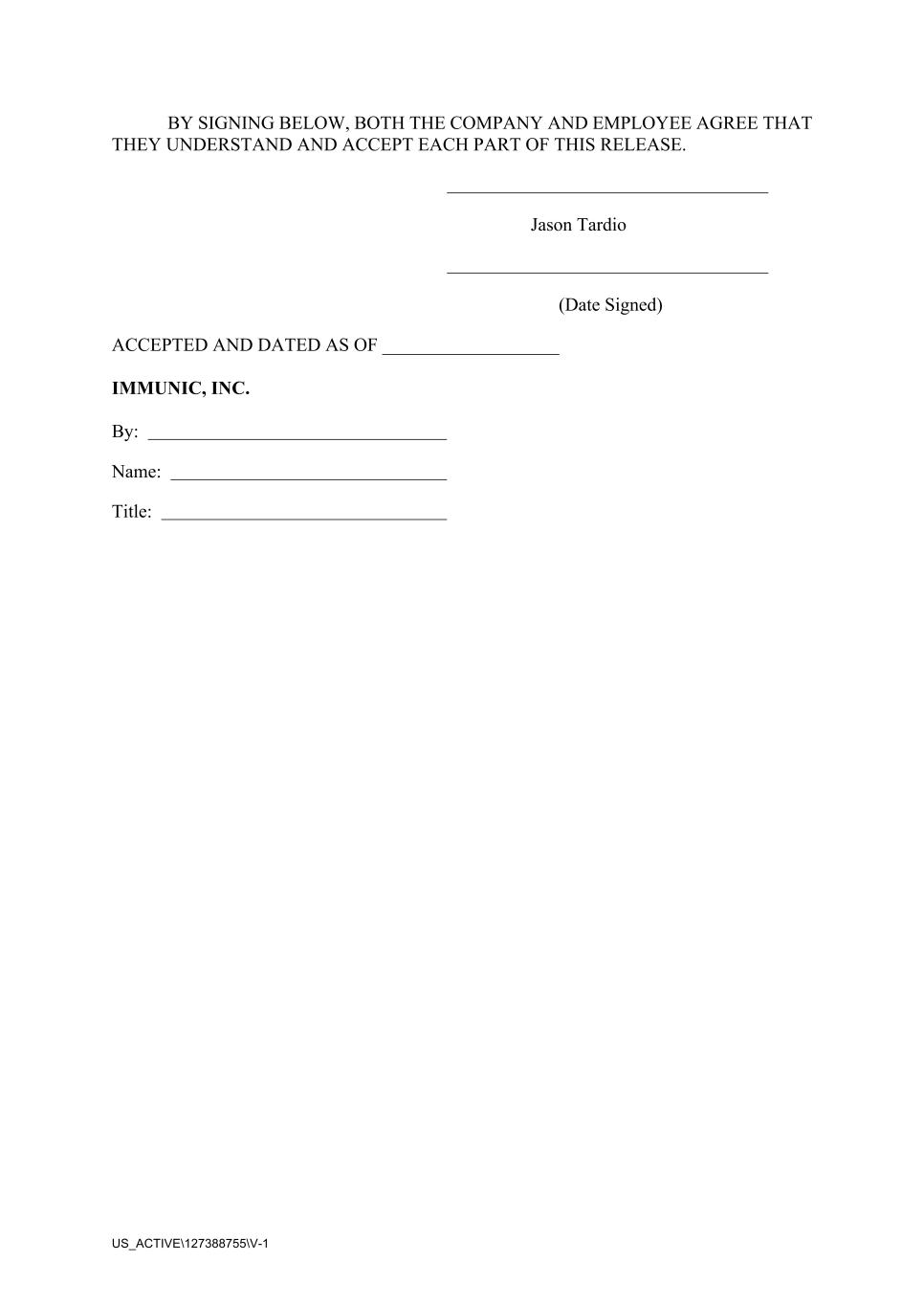 US_ACTIVE\127388755\V-1 BY SIGNING BELOW, BOTH THE COMPANY AND EMPLOYEE AGREE THAT THEY UNDERSTAND AND ACCEPT EACH PART OF THIS RELEASE. Jason Tardio (Date Signed) ACCEPTED AND DATED AS OF ___________________ IMMUNIC, INC. By: Name: Title: