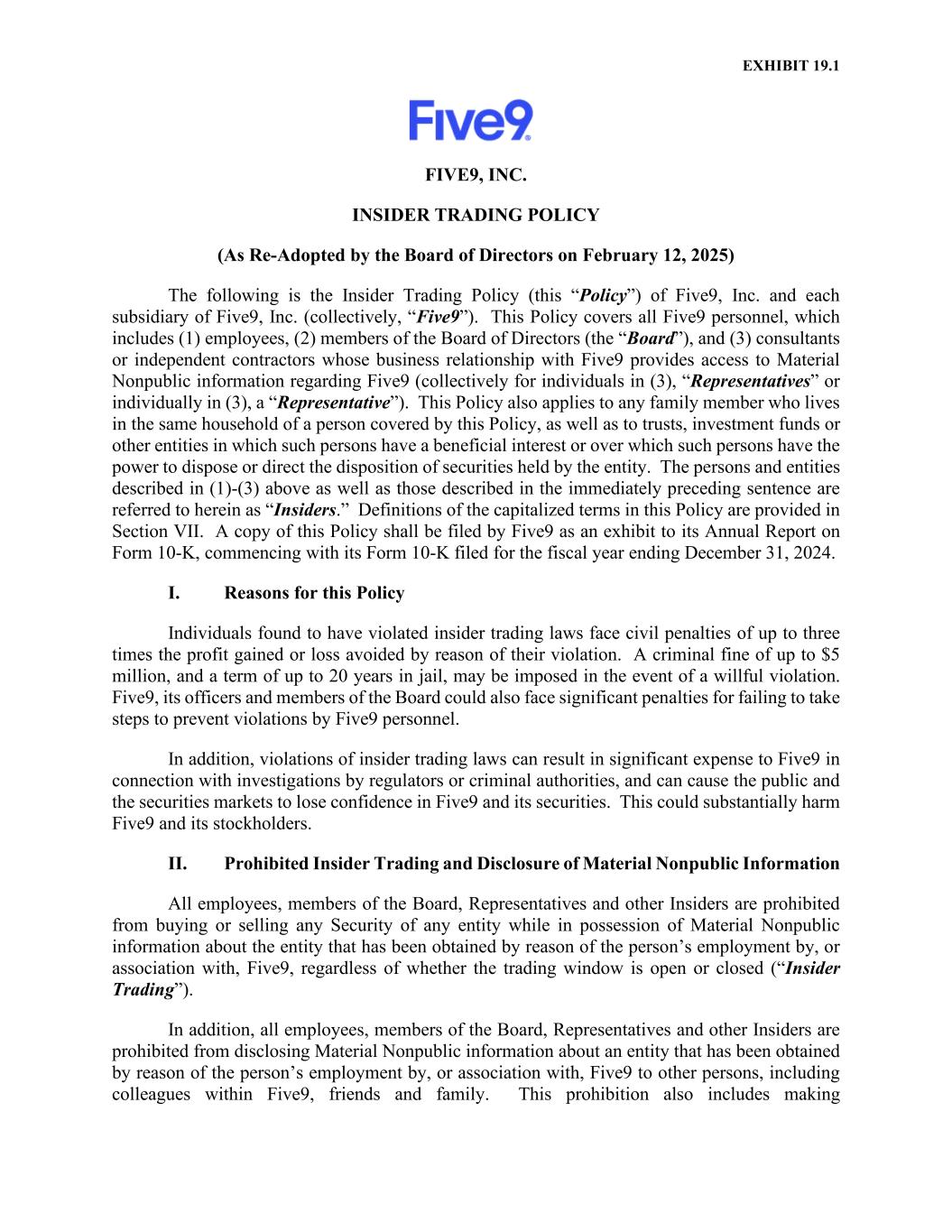 EXHIBIT 19.1 FIVE9, INC. INSIDER TRADING POLICY (As Re-Adopted by the Board of Directors on February 12, 2025) The following is the Insider Trading Policy (this “Policy”) of Five9, Inc. and each subsidiary of Five9, Inc. (collectively, “Five9”). This Policy covers all Five9 personnel, which includes (1) employees, (2) members of the Board of Directors (the “Board”), and (3) consultants or independent contractors whose business relationship with Five9 provides access to Material Nonpublic information regarding Five9 (collectively for individuals in (3), “Representatives” or individually in (3), a “Representative”). This Policy also applies to any family member who lives in the same household of a person covered by this Policy, as well as to trusts, investment funds or other entities in which such persons have a beneficial interest or over which such persons have the power to dispose or direct the disposition of securities held by the entity. The persons and entities described in (1)-(3) above as well as those described in the immediately preceding sentence are referred to herein as “Insiders.” Definitions of the capitalized terms in this Policy are provided in Section VII. A copy of this Policy shall be filed by Five9 as an exhibit to its Annual Report on Form 10-K, commencing with its Form 10-K filed for the fiscal year ending December 31, 2024. I. Reasons for this Policy Individuals found to have violated insider trading laws face civil penalties of up to three times the profit gained or loss avoided by reason of their violation. A criminal fine of up to $5 million, and a term of up to 20 years in jail, may be imposed in the event of a willful violation. Five9, its officers and members of the Board could also face significant penalties for failing to take steps to prevent violations by Five9 personnel. In addition, violations of insider trading laws can result in significant expense to Five9 in connection with investigations by regulators or criminal authorities, and can cause the public and the securities markets to lose confidence in Five9 and its securities. This could substantially harm Five9 and its stockholders. II. Prohibited Insider Trading and Disclosure of Material Nonpublic Information All employees, members of the Board, Representatives and other Insiders are prohibited from buying or selling any Security of any entity while in possession of Material Nonpublic information about the entity that has been obtained by reason of the person’s employment by, or association with, Five9, regardless of whether the trading window is open or closed (“Insider Trading”). In addition, all employees, members of the Board, Representatives and other Insiders are prohibited from disclosing Material Nonpublic information about an entity that has been obtained by reason of the person’s employment by, or association with, Five9 to other persons, including colleagues within Five9, friends and family. This prohibition also includes making