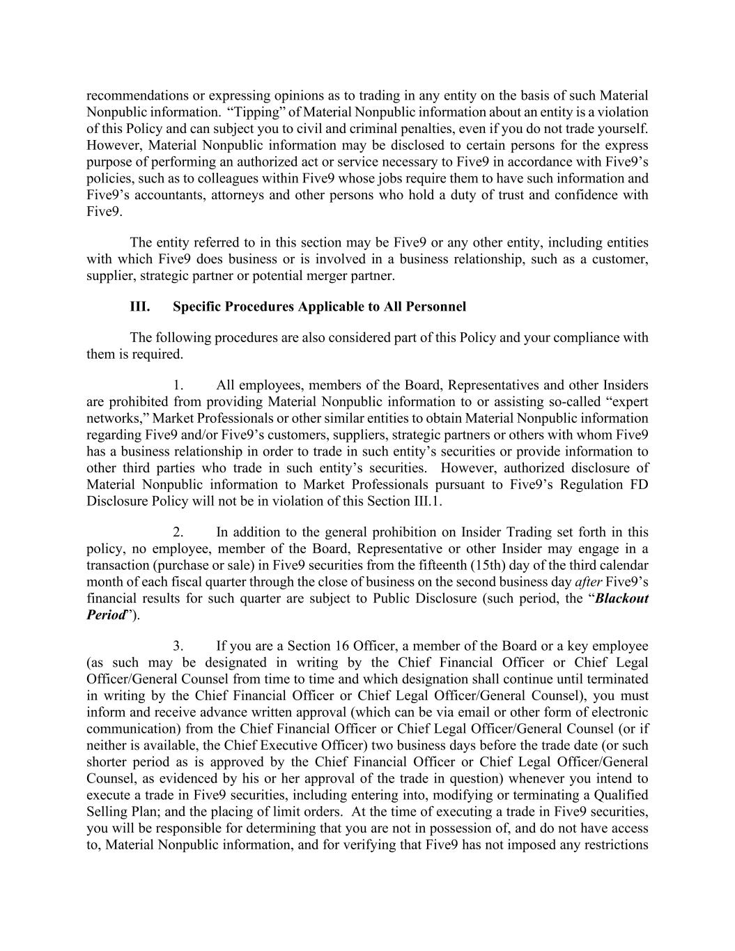 recommendations or expressing opinions as to trading in any entity on the basis of such Material Nonpublic information. “Tipping” of Material Nonpublic information about an entity is a violation of this Policy and can subject you to civil and criminal penalties, even if you do not trade yourself. However, Material Nonpublic information may be disclosed to certain persons for the express purpose of performing an authorized act or service necessary to Five9 in accordance with Five9’s policies, such as to colleagues within Five9 whose jobs require them to have such information and Five9’s accountants, attorneys and other persons who hold a duty of trust and confidence with Five9. The entity referred to in this section may be Five9 or any other entity, including entities with which Five9 does business or is involved in a business relationship, such as a customer, supplier, strategic partner or potential merger partner. III. Specific Procedures Applicable to All Personnel The following procedures are also considered part of this Policy and your compliance with them is required. 1. All employees, members of the Board, Representatives and other Insiders are prohibited from providing Material Nonpublic information to or assisting so-called “expert networks,” Market Professionals or other similar entities to obtain Material Nonpublic information regarding Five9 and/or Five9’s customers, suppliers, strategic partners or others with whom Five9 has a business relationship in order to trade in such entity’s securities or provide information to other third parties who trade in such entity’s securities. However, authorized disclosure of Material Nonpublic information to Market Professionals pursuant to Five9’s Regulation FD Disclosure Policy will not be in violation of this Section III.1. 2. In addition to the general prohibition on Insider Trading set forth in this policy, no employee, member of the Board, Representative or other Insider may engage in a transaction (purchase or sale) in Five9 securities from the fifteenth (15th) day of the third calendar month of each fiscal quarter through the close of business on the second business day after Five9’s financial results for such quarter are subject to Public Disclosure (such period, the “Blackout Period”). 3. If you are a Section 16 Officer, a member of the Board or a key employee (as such may be designated in writing by the Chief Financial Officer or Chief Legal Officer/General Counsel from time to time and which designation shall continue until terminated in writing by the Chief Financial Officer or Chief Legal Officer/General Counsel), you must inform and receive advance written approval (which can be via email or other form of electronic communication) from the Chief Financial Officer or Chief Legal Officer/General Counsel (or if neither is available, the Chief Executive Officer) two business days before the trade date (or such shorter period as is approved by the Chief Financial Officer or Chief Legal Officer/General Counsel, as evidenced by his or her approval of the trade in question) whenever you intend to execute a trade in Five9 securities, including entering into, modifying or terminating a Qualified Selling Plan; and the placing of limit orders. At the time of executing a trade in Five9 securities, you will be responsible for determining that you are not in possession of, and do not have access to, Material Nonpublic information, and for verifying that Five9 has not imposed any restrictions
