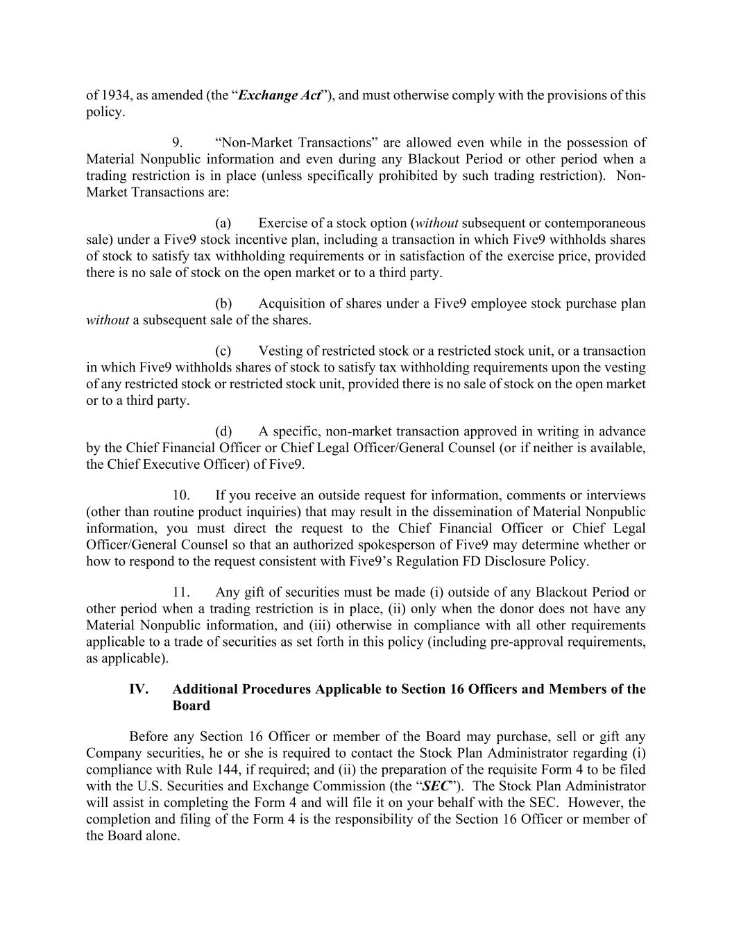 of 1934, as amended (the “Exchange Act”), and must otherwise comply with the provisions of this policy. 9. “Non-Market Transactions” are allowed even while in the possession of Material Nonpublic information and even during any Blackout Period or other period when a trading restriction is in place (unless specifically prohibited by such trading restriction). Non- Market Transactions are: (a) Exercise of a stock option (without subsequent or contemporaneous sale) under a Five9 stock incentive plan, including a transaction in which Five9 withholds shares of stock to satisfy tax withholding requirements or in satisfaction of the exercise price, provided there is no sale of stock on the open market or to a third party. (b) Acquisition of shares under a Five9 employee stock purchase plan without a subsequent sale of the shares. (c) Vesting of restricted stock or a restricted stock unit, or a transaction in which Five9 withholds shares of stock to satisfy tax withholding requirements upon the vesting of any restricted stock or restricted stock unit, provided there is no sale of stock on the open market or to a third party. (d) A specific, non-market transaction approved in writing in advance by the Chief Financial Officer or Chief Legal Officer/General Counsel (or if neither is available, the Chief Executive Officer) of Five9. 10. If you receive an outside request for information, comments or interviews (other than routine product inquiries) that may result in the dissemination of Material Nonpublic information, you must direct the request to the Chief Financial Officer or Chief Legal Officer/General Counsel so that an authorized spokesperson of Five9 may determine whether or how to respond to the request consistent with Five9’s Regulation FD Disclosure Policy. 11. Any gift of securities must be made (i) outside of any Blackout Period or other period when a trading restriction is in place, (ii) only when the donor does not have any Material Nonpublic information, and (iii) otherwise in compliance with all other requirements applicable to a trade of securities as set forth in this policy (including pre-approval requirements, as applicable). IV. Additional Procedures Applicable to Section 16 Officers and Members of the Board Before any Section 16 Officer or member of the Board may purchase, sell or gift any Company securities, he or she is required to contact the Stock Plan Administrator regarding (i) compliance with Rule 144, if required; and (ii) the preparation of the requisite Form 4 to be filed with the U.S. Securities and Exchange Commission (the “SEC”). The Stock Plan Administrator will assist in completing the Form 4 and will file it on your behalf with the SEC. However, the completion and filing of the Form 4 is the responsibility of the Section 16 Officer or member of the Board alone.