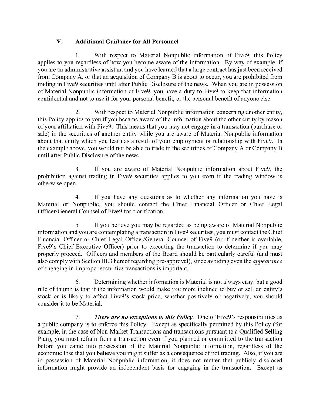 V. Additional Guidance for All Personnel 1. With respect to Material Nonpublic information of Five9, this Policy applies to you regardless of how you become aware of the information. By way of example, if you are an administrative assistant and you have learned that a large contract has just been received from Company A, or that an acquisition of Company B is about to occur, you are prohibited from trading in Five9 securities until after Public Disclosure of the news. When you are in possession of Material Nonpublic information of Five9, you have a duty to Five9 to keep that information confidential and not to use it for your personal benefit, or the personal benefit of anyone else. 2. With respect to Material Nonpublic information concerning another entity, this Policy applies to you if you became aware of the information about the other entity by reason of your affiliation with Five9. This means that you may not engage in a transaction (purchase or sale) in the securities of another entity while you are aware of Material Nonpublic information about that entity which you learn as a result of your employment or relationship with Five9. In the example above, you would not be able to trade in the securities of Company A or Company B until after Public Disclosure of the news. 3. If you are aware of Material Nonpublic information about Five9, the prohibition against trading in Five9 securities applies to you even if the trading window is otherwise open. 4. If you have any questions as to whether any information you have is Material or Nonpublic, you should contact the Chief Financial Officer or Chief Legal Officer/General Counsel of Five9 for clarification. 5. If you believe you may be regarded as being aware of Material Nonpublic information and you are contemplating a transaction in Five9 securities, you must contact the Chief Financial Officer or Chief Legal Officer/General Counsel of Five9 (or if neither is available, Five9’s Chief Executive Officer) prior to executing the transaction to determine if you may properly proceed. Officers and members of the Board should be particularly careful (and must also comply with Section III.3 hereof regarding pre-approval), since avoiding even the appearance of engaging in improper securities transactions is important. 6. Determining whether information is Material is not always easy, but a good rule of thumb is that if the information would make you more inclined to buy or sell an entity’s stock or is likely to affect Five9’s stock price, whether positively or negatively, you should consider it to be Material. 7. There are no exceptions to this Policy. One of Five9’s responsibilities as a public company is to enforce this Policy. Except as specifically permitted by this Policy (for example, in the case of Non-Market Transactions and transactions pursuant to a Qualified Selling Plan), you must refrain from a transaction even if you planned or committed to the transaction before you came into possession of the Material Nonpublic information, regardless of the economic loss that you believe you might suffer as a consequence of not trading. Also, if you are in possession of Material Nonpublic information, it does not matter that publicly disclosed information might provide an independent basis for engaging in the transaction. Except as