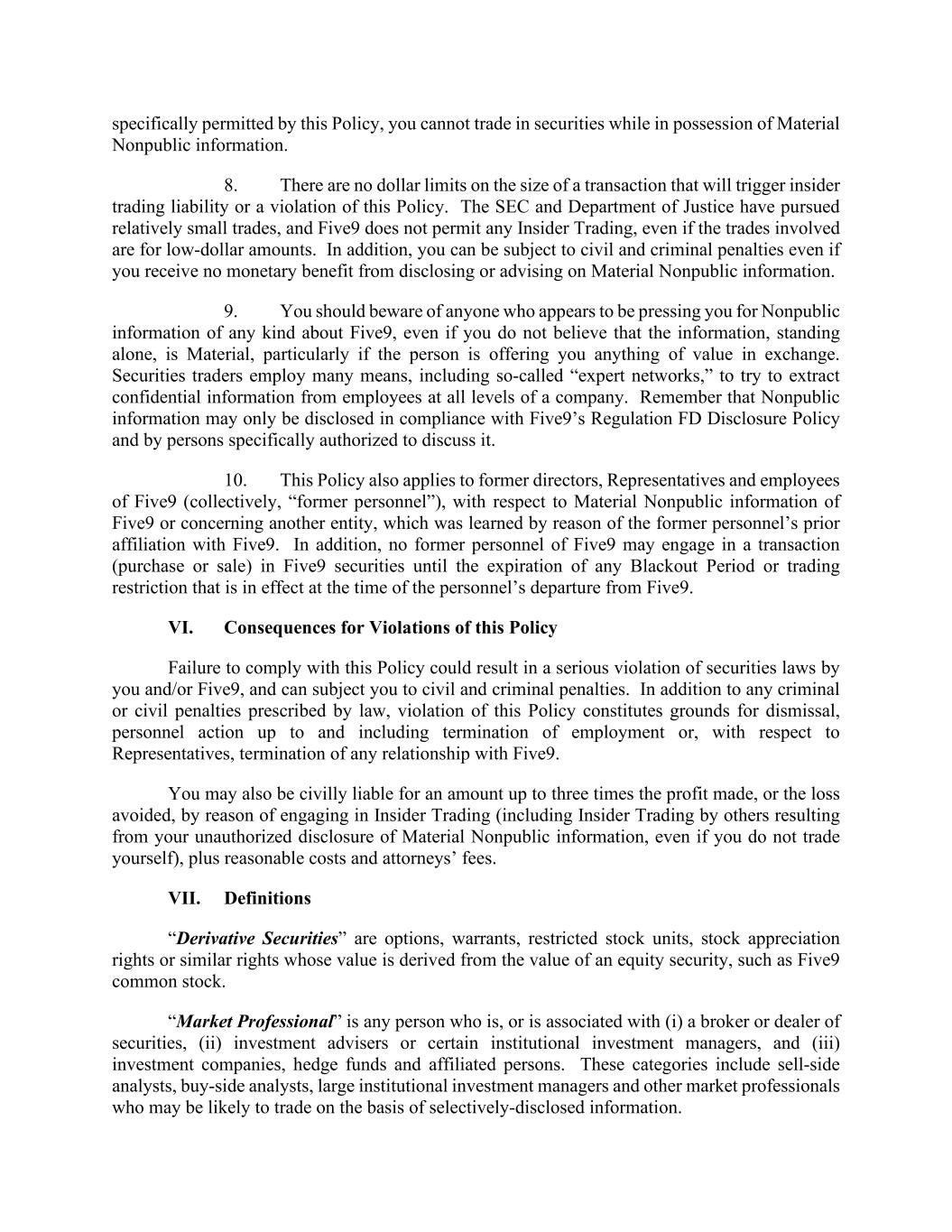 specifically permitted by this Policy, you cannot trade in securities while in possession of Material Nonpublic information. 8. There are no dollar limits on the size of a transaction that will trigger insider trading liability or a violation of this Policy. The SEC and Department of Justice have pursued relatively small trades, and Five9 does not permit any Insider Trading, even if the trades involved are for low-dollar amounts. In addition, you can be subject to civil and criminal penalties even if you receive no monetary benefit from disclosing or advising on Material Nonpublic information. 9. You should beware of anyone who appears to be pressing you for Nonpublic information of any kind about Five9, even if you do not believe that the information, standing alone, is Material, particularly if the person is offering you anything of value in exchange. Securities traders employ many means, including so-called “expert networks,” to try to extract confidential information from employees at all levels of a company. Remember that Nonpublic information may only be disclosed in compliance with Five9’s Regulation FD Disclosure Policy and by persons specifically authorized to discuss it. 10. This Policy also applies to former directors, Representatives and employees of Five9 (collectively, “former personnel”), with respect to Material Nonpublic information of Five9 or concerning another entity, which was learned by reason of the former personnel’s prior affiliation with Five9. In addition, no former personnel of Five9 may engage in a transaction (purchase or sale) in Five9 securities until the expiration of any Blackout Period or trading restriction that is in effect at the time of the personnel’s departure from Five9. VI. Consequences for Violations of this Policy Failure to comply with this Policy could result in a serious violation of securities laws by you and/or Five9, and can subject you to civil and criminal penalties. In addition to any criminal or civil penalties prescribed by law, violation of this Policy constitutes grounds for dismissal, personnel action up to and including termination of employment or, with respect to Representatives, termination of any relationship with Five9. You may also be civilly liable for an amount up to three times the profit made, or the loss avoided, by reason of engaging in Insider Trading (including Insider Trading by others resulting from your unauthorized disclosure of Material Nonpublic information, even if you do not trade yourself), plus reasonable costs and attorneys’ fees. VII. Definitions “Derivative Securities” are options, warrants, restricted stock units, stock appreciation rights or similar rights whose value is derived from the value of an equity security, such as Five9 common stock. “Market Professional” is any person who is, or is associated with (i) a broker or dealer of securities, (ii) investment advisers or certain institutional investment managers, and (iii) investment companies, hedge funds and affiliated persons. These categories include sell-side analysts, buy-side analysts, large institutional investment managers and other market professionals who may be likely to trade on the basis of selectively-disclosed information.