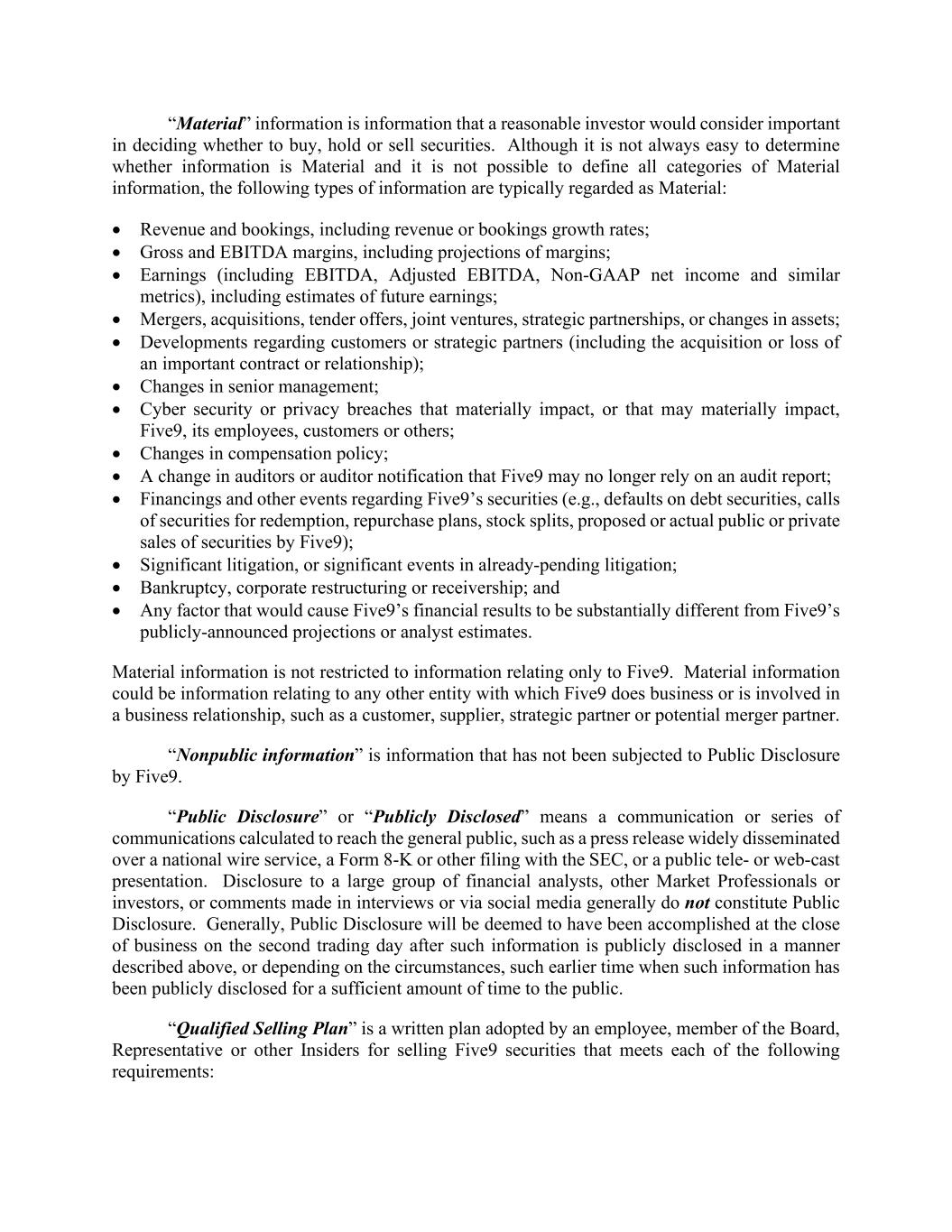 “Material” information is information that a reasonable investor would consider important in deciding whether to buy, hold or sell securities. Although it is not always easy to determine whether information is Material and it is not possible to define all categories of Material information, the following types of information are typically regarded as Material: • Revenue and bookings, including revenue or bookings growth rates; • Gross and EBITDA margins, including projections of margins; • Earnings (including EBITDA, Adjusted EBITDA, Non-GAAP net income and similar metrics), including estimates of future earnings; • Mergers, acquisitions, tender offers, joint ventures, strategic partnerships, or changes in assets; • Developments regarding customers or strategic partners (including the acquisition or loss of an important contract or relationship); • Changes in senior management; • Cyber security or privacy breaches that materially impact, or that may materially impact, Five9, its employees, customers or others; • Changes in compensation policy; • A change in auditors or auditor notification that Five9 may no longer rely on an audit report; • Financings and other events regarding Five9’s securities (e.g., defaults on debt securities, calls of securities for redemption, repurchase plans, stock splits, proposed or actual public or private sales of securities by Five9); • Significant litigation, or significant events in already-pending litigation; • Bankruptcy, corporate restructuring or receivership; and • Any factor that would cause Five9’s financial results to be substantially different from Five9’s publicly-announced projections or analyst estimates. Material information is not restricted to information relating only to Five9. Material information could be information relating to any other entity with which Five9 does business or is involved in a business relationship, such as a customer, supplier, strategic partner or potential merger partner. “Nonpublic information” is information that has not been subjected to Public Disclosure by Five9. “Public Disclosure” or “Publicly Disclosed” means a communication or series of communications calculated to reach the general public, such as a press release widely disseminated over a national wire service, a Form 8-K or other filing with the SEC, or a public tele- or web-cast presentation. Disclosure to a large group of financial analysts, other Market Professionals or investors, or comments made in interviews or via social media generally do not constitute Public Disclosure. Generally, Public Disclosure will be deemed to have been accomplished at the close of business on the second trading day after such information is publicly disclosed in a manner described above, or depending on the circumstances, such earlier time when such information has been publicly disclosed for a sufficient amount of time to the public. “Qualified Selling Plan” is a written plan adopted by an employee, member of the Board, Representative or other Insiders for selling Five9 securities that meets each of the following requirements: