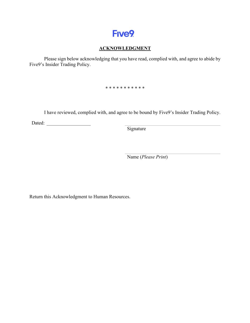 ACKNOWLEDGMENT Please sign below acknowledging that you have read, complied with, and agree to abide by Five9’s Insider Trading Policy. * * * * * * * * * * * I have reviewed, complied with, and agree to be bound by Five9’s Insider Trading Policy. Dated: __________________ Signature Name (Please Print) Return this Acknowledgment to Human Resources.
