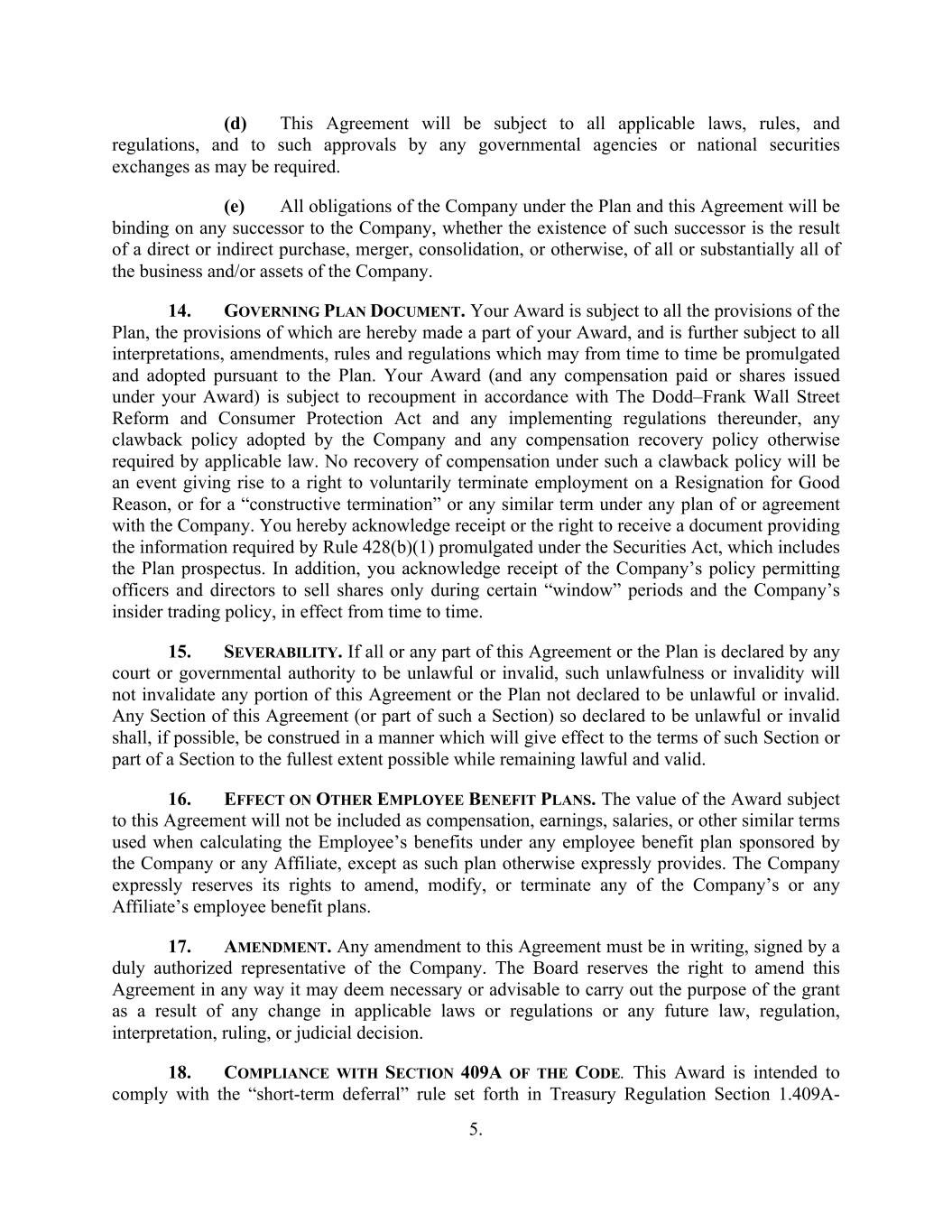 5. (d) This Agreement will be subject to all applicable laws, rules, and regulations, and to such approvals by any governmental agencies or national securities exchanges as may be required. (e) All obligations of the Company under the Plan and this Agreement will be binding on any successor to the Company, whether the existence of such successor is the result of a direct or indirect purchase, merger, consolidation, or otherwise, of all or substantially all of the business and/or assets of the Company. 14. GOVERNING PLAN DOCUMENT. Your Award is subject to all the provisions of the Plan, the provisions of which are hereby made a part of your Award, and is further subject to all interpretations, amendments, rules and regulations which may from time to time be promulgated and adopted pursuant to the Plan. Your Award (and any compensation paid or shares issued under your Award) is subject to recoupment in accordance with The Dodd–Frank Wall Street Reform and Consumer Protection Act and any implementing regulations thereunder, any clawback policy adopted by the Company and any compensation recovery policy otherwise required by applicable law. No recovery of compensation under such a clawback policy will be an event giving rise to a right to voluntarily terminate employment on a Resignation for Good Reason, or for a “constructive termination” or any similar term under any plan of or agreement with the Company. You hereby acknowledge receipt or the right to receive a document providing the information required by Rule 428(b)(1) promulgated under the Securities Act, which includes the Plan prospectus. In addition, you acknowledge receipt of the Company’s policy permitting officers and directors to sell shares only during certain “window” periods and the Company’s insider trading policy, in effect from time to time. 15. SEVERABILITY. If all or any part of this Agreement or the Plan is declared by any court or governmental authority to be unlawful or invalid, such unlawfulness or invalidity will not invalidate any portion of this Agreement or the Plan not declared to be unlawful or invalid. Any Section of this Agreement (or part of such a Section) so declared to be unlawful or invalid shall, if possible, be construed in a manner which will give effect to the terms of such Section or part of a Section to the fullest extent possible while remaining lawful and valid. 16. EFFECT ON OTHER EMPLOYEE BENEFIT PLANS. The value of the Award subject to this Agreement will not be included as compensation, earnings, salaries, or other similar terms used when calculating the Employee’s benefits under any employee benefit plan sponsored by the Company or any Affiliate, except as such plan otherwise expressly provides. The Company expressly reserves its rights to amend, modify, or terminate any of the Company’s or any Affiliate’s employee benefit plans. 17. AMENDMENT. Any amendment to this Agreement must be in writing, signed by a duly authorized representative of the Company. The Board reserves the right to amend this Agreement in any way it may deem necessary or advisable to carry out the purpose of the grant as a result of any change in applicable laws or regulations or any future law, regulation, interpretation, ruling, or judicial decision. 18. COMPLIANCE WITH SECTION 409A OF THE CODE. This Award is intended to comply with the “short-term deferral” rule set forth in Treasury Regulation Section 1.409A-