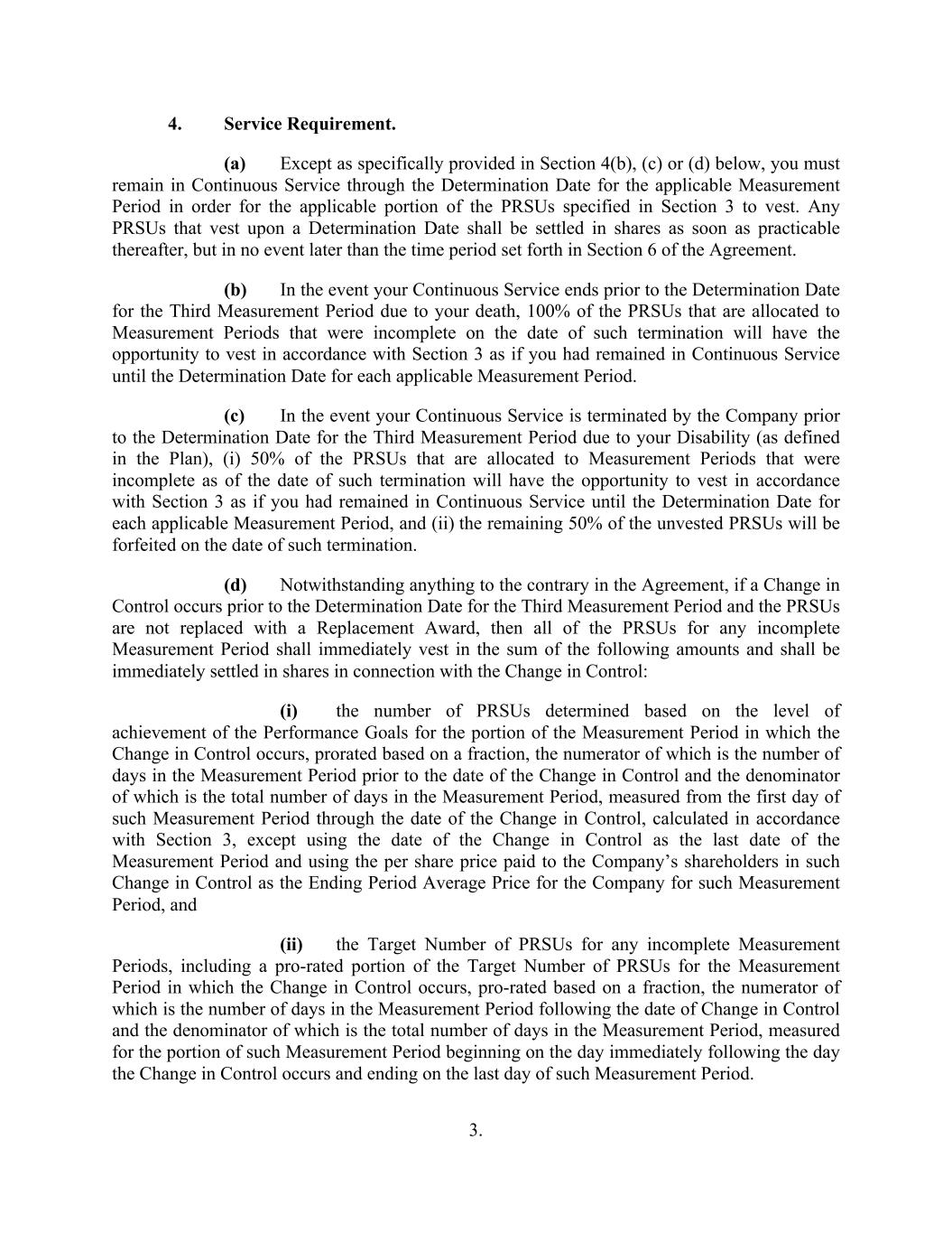 3. 4. Service Requirement. (a) Except as specifically provided in Section 4(b), (c) or (d) below, you must remain in Continuous Service through the Determination Date for the applicable Measurement Period in order for the applicable portion of the PRSUs specified in Section 3 to vest. Any PRSUs that vest upon a Determination Date shall be settled in shares as soon as practicable thereafter, but in no event later than the time period set forth in Section 6 of the Agreement. (b) In the event your Continuous Service ends prior to the Determination Date for the Third Measurement Period due to your death, 100% of the PRSUs that are allocated to Measurement Periods that were incomplete on the date of such termination will have the opportunity to vest in accordance with Section 3 as if you had remained in Continuous Service until the Determination Date for each applicable Measurement Period. (c) In the event your Continuous Service is terminated by the Company prior to the Determination Date for the Third Measurement Period due to your Disability (as defined in the Plan), (i) 50% of the PRSUs that are allocated to Measurement Periods that were incomplete as of the date of such termination will have the opportunity to vest in accordance with Section 3 as if you had remained in Continuous Service until the Determination Date for each applicable Measurement Period, and (ii) the remaining 50% of the unvested PRSUs will be forfeited on the date of such termination. (d) Notwithstanding anything to the contrary in the Agreement, if a Change in Control occurs prior to the Determination Date for the Third Measurement Period and the PRSUs are not replaced with a Replacement Award, then all of the PRSUs for any incomplete Measurement Period shall immediately vest in the sum of the following amounts and shall be immediately settled in shares in connection with the Change in Control: (i) the number of PRSUs determined based on the level of achievement of the Performance Goals for the portion of the Measurement Period in which the Change in Control occurs, prorated based on a fraction, the numerator of which is the number of days in the Measurement Period prior to the date of the Change in Control and the denominator of which is the total number of days in the Measurement Period, measured from the first day of such Measurement Period through the date of the Change in Control, calculated in accordance with Section 3, except using the date of the Change in Control as the last date of the Measurement Period and using the per share price paid to the Company’s shareholders in such Change in Control as the Ending Period Average Price for the Company for such Measurement Period, and (ii) the Target Number of PRSUs for any incomplete Measurement Periods, including a pro-rated portion of the Target Number of PRSUs for the Measurement Period in which the Change in Control occurs, pro-rated based on a fraction, the numerator of which is the number of days in the Measurement Period following the date of Change in Control and the denominator of which is the total number of days in the Measurement Period, measured for the portion of such Measurement Period beginning on the day immediately following the day the Change in Control occurs and ending on the last day of such Measurement Period.