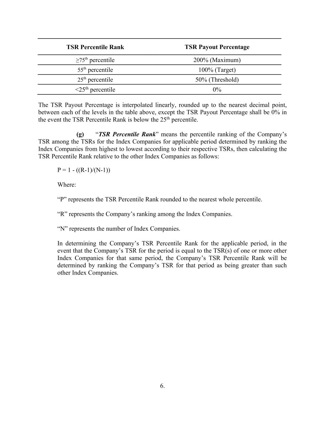 6. TSR Percentile Rank TSR Payout Percentage ≥75th percentile 200% (Maximum) 55th percentile 100% (Target) 25th percentile 50% (Threshold) <25th percentile 0% The TSR Payout Percentage is interpolated linearly, rounded up to the nearest decimal point, between each of the levels in the table above, except the TSR Payout Percentage shall be 0% in the event the TSR Percentile Rank is below the 25th percentile. (g) “TSR Percentile Rank” means the percentile ranking of the Company’s TSR among the TSRs for the Index Companies for applicable period determined by ranking the Index Companies from highest to lowest according to their respective TSRs, then calculating the TSR Percentile Rank relative to the other Index Companies as follows: P = 1 - ((R-1)/(N-1)) Where: “P” represents the TSR Percentile Rank rounded to the nearest whole percentile. “R” represents the Company’s ranking among the Index Companies. “N” represents the number of Index Companies. In determining the Company’s TSR Percentile Rank for the applicable period, in the event that the Company’s TSR for the period is equal to the TSR(s) of one or more other Index Companies for that same period, the Company’s TSR Percentile Rank will be determined by ranking the Company’s TSR for that period as being greater than such other Index Companies.