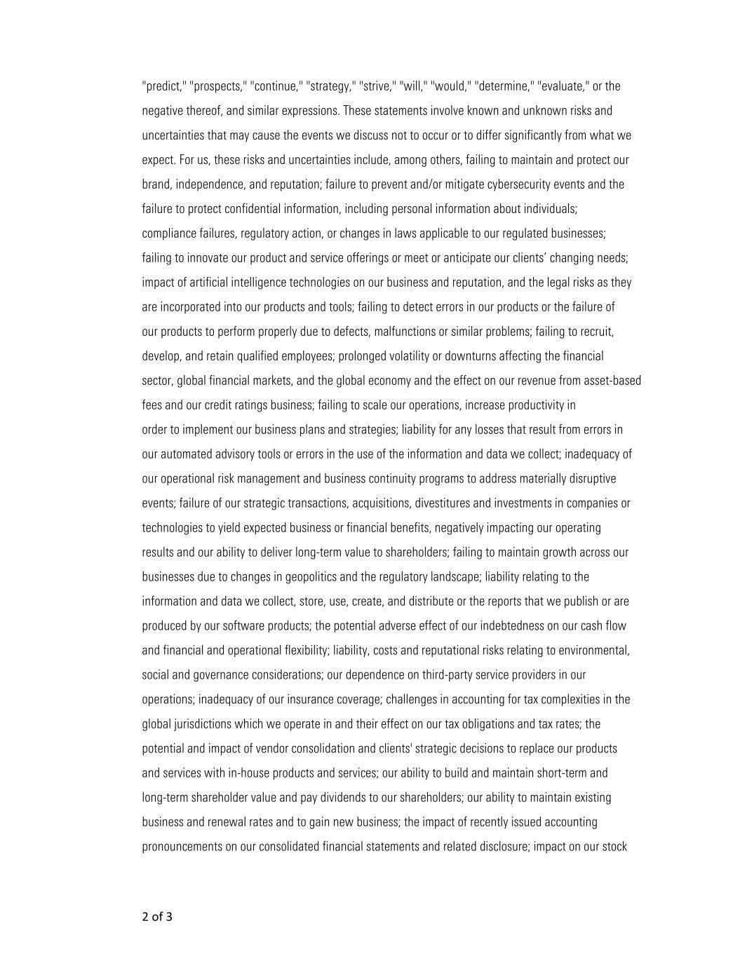 2 of 3 "predict," "prospects," "continue," "strategy," "strive," "will," "would," "determine," "evaluate," or the negative thereof, and similar expressions. These statements involve known and unknown risks and uncertainties that may cause the events we discuss not to occur or to differ significantly from what we expect. For us, these risks and uncertainties include, among others, failing to maintain and protect our brand, independence, and reputation; failure to prevent and/or mitigate cybersecurity events and the failure to protect confidential information, including personal information about individuals; compliance failures, regulatory action, or changes in laws applicable to our regulated businesses; failing to innovate our product and service offerings or meet or anticipate our clients’ changing needs; impact of artificial intelligence technologies on our business and reputation, and the legal risks as they are incorporated into our products and tools; failing to detect errors in our products or the failure of our products to perform properly due to defects, malfunctions or similar problems; failing to recruit, develop, and retain qualified employees; prolonged volatility or downturns affecting the financial sector, global financial markets, and the global economy and the effect on our revenue from asset-based fees and our credit ratings business; failing to scale our operations, increase productivity in order to implement our business plans and strategies; liability for any losses that result from errors in our automated advisory tools or errors in the use of the information and data we collect; inadequacy of our operational risk management and business continuity programs to address materially disruptive events; failure of our strategic transactions, acquisitions, divestitures and investments in companies or technologies to yield expected business or financial benefits, negatively impacting our operating results and our ability to deliver long-term value to shareholders; failing to maintain growth across our businesses due to changes in geopolitics and the regulatory landscape; liability relating to the information and data we collect, store, use, create, and distribute or the reports that we publish or are produced by our software products; the potential adverse effect of our indebtedness on our cash flow and financial and operational flexibility; liability, costs and reputational risks relating to environmental, social and governance considerations; our dependence on third-party service providers in our operations; inadequacy of our insurance coverage; challenges in accounting for tax complexities in the global jurisdictions which we operate in and their effect on our tax obligations and tax rates; the potential and impact of vendor consolidation and clients' strategic decisions to replace our products and services with in-house products and services; our ability to build and maintain short-term and long-term shareholder value and pay dividends to our shareholders; our ability to maintain existing business and renewal rates and to gain new business; the impact of recently issued accounting pronouncements on our consolidated financial statements and related disclosure; impact on our stock