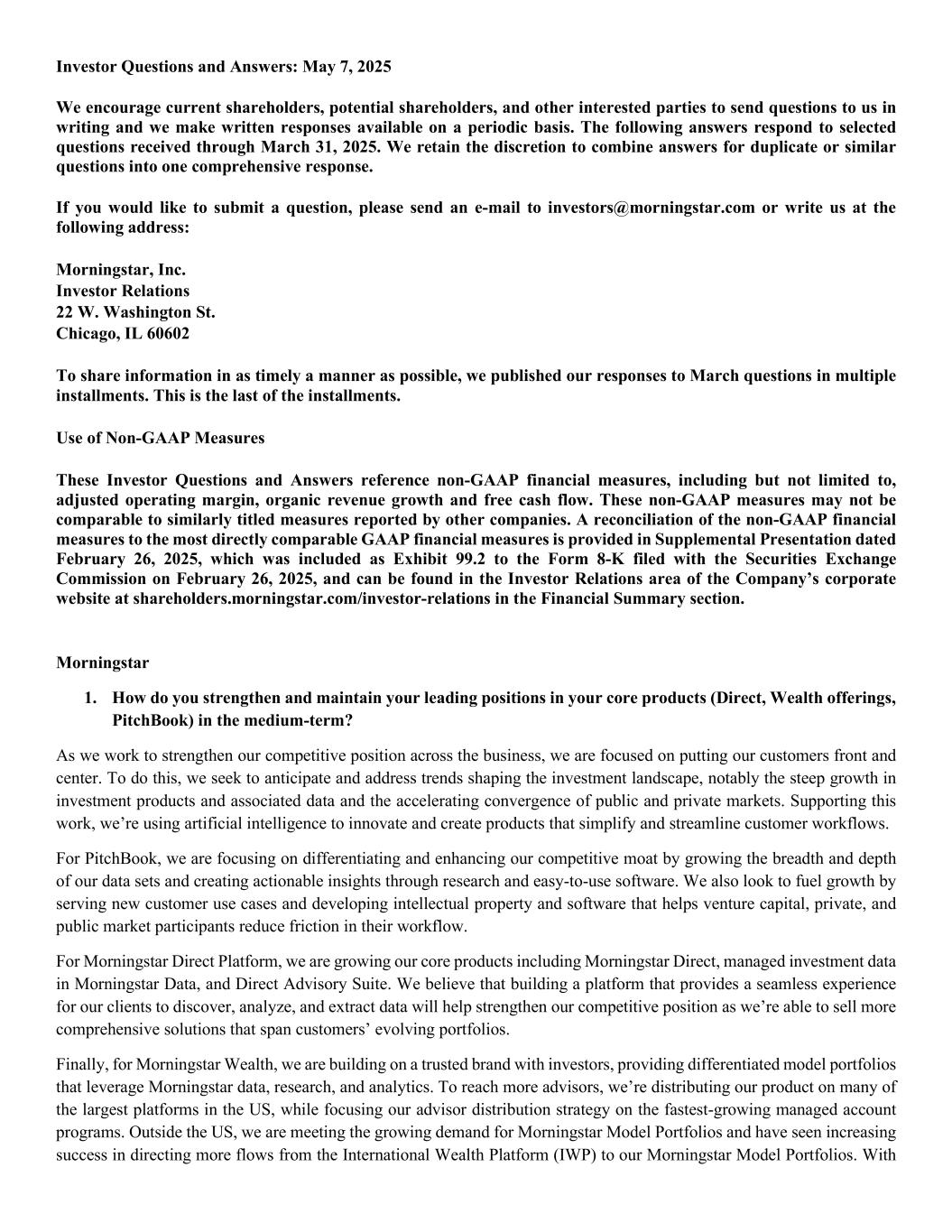 Investor Questions and Answers: May 7, 2025 We encourage current shareholders, potential shareholders, and other interested parties to send questions to us in writing and we make written responses available on a periodic basis. The following answers respond to selected questions received through March 31, 2025. We retain the discretion to combine answers for duplicate or similar questions into one comprehensive response. If you would like to submit a question, please send an e-mail to investors@morningstar.com or write us at the following address: Morningstar, Inc. Investor Relations 22 W. Washington St. Chicago, IL 60602 To share information in as timely a manner as possible, we published our responses to March questions in multiple installments. This is the last of the installments. Use of Non-GAAP Measures These Investor Questions and Answers reference non-GAAP financial measures, including but not limited to, adjusted operating margin, organic revenue growth and free cash flow. These non-GAAP measures may not be comparable to similarly titled measures reported by other companies. A reconciliation of the non-GAAP financial measures to the most directly comparable GAAP financial measures is provided in Supplemental Presentation dated February 26, 2025, which was included as Exhibit 99.2 to the Form 8-K filed with the Securities Exchange Commission on February 26, 2025, and can be found in the Investor Relations area of the Company’s corporate website at shareholders.morningstar.com/investor-relations in the Financial Summary section. Morningstar 1. How do you strengthen and maintain your leading positions in your core products (Direct, Wealth offerings, PitchBook) in the medium-term? As we work to strengthen our competitive position across the business, we are focused on putting our customers front and center. To do this, we seek to anticipate and address trends shaping the investment landscape, notably the steep growth in investment products and associated data and the accelerating convergence of public and private markets. Supporting this work, we’re using artificial intelligence to innovate and create products that simplify and streamline customer workflows. For PitchBook, we are focusing on differentiating and enhancing our competitive moat by growing the breadth and depth of our data sets and creating actionable insights through research and easy-to-use software. We also look to fuel growth by serving new customer use cases and developing intellectual property and software that helps venture capital, private, and public market participants reduce friction in their workflow. For Morningstar Direct Platform, we are growing our core products including Morningstar Direct, managed investment data in Morningstar Data, and Direct Advisory Suite. We believe that building a platform that provides a seamless experience for our clients to discover, analyze, and extract data will help strengthen our competitive position as we’re able to sell more comprehensive solutions that span customers’ evolving portfolios. Finally, for Morningstar Wealth, we are building on a trusted brand with investors, providing differentiated model portfolios that leverage Morningstar data, research, and analytics. To reach more advisors, we’re distributing our product on many of the largest platforms in the US, while focusing our advisor distribution strategy on the fastest-growing managed account programs. Outside the US, we are meeting the growing demand for Morningstar Model Portfolios and have seen increasing success in directing more flows from the International Wealth Platform (IWP) to our Morningstar Model Portfolios. With
